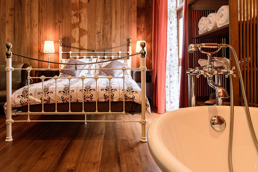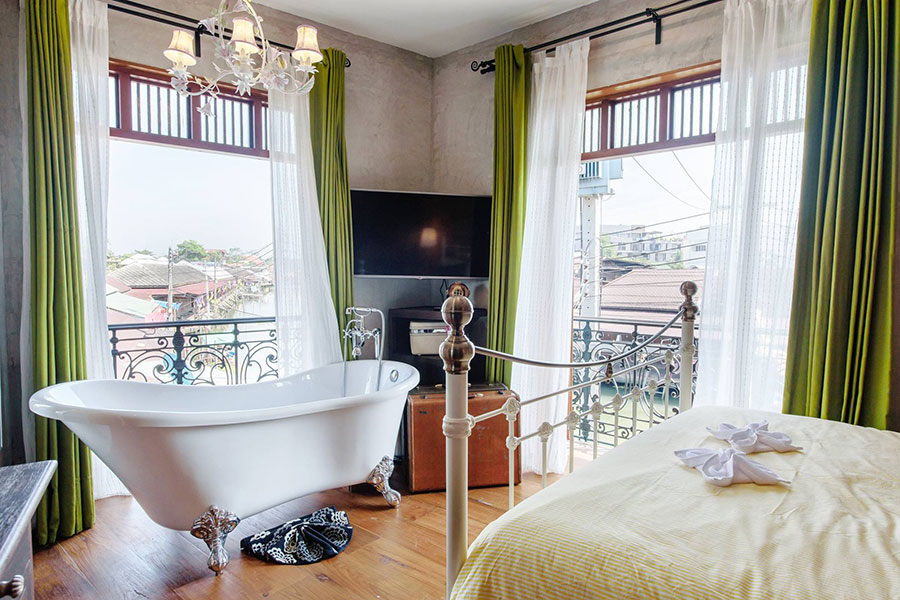 เริ่มต้นที่ ริมระเบียง อัมพวา คาเฟ่ แอนด์ สวีท ที่พักวิวดีมีทั้งห้องพักและคาเฟ่ ห้องพักมีให้เลือกทั้งหมด 3 ห้อง ภายในตกแต่งด้วยเฟอร์นิเจอร์ไม้สุดหรู เพิ่มเสน่ห์ด้วยอ่างขาสิงห์ที่สามารถลงไปนอนแช่น้ำได้สบายๆ ให้ได้ดื่มด่ำกับบรรยากาศของอัมพวาที่บอกเลยว่าต้องกลับมาซ้ำอีกรอบแน่นอน ในส่วนของคาเฟ่ที่อยู่ชั้นล่างมีอาหารให้ลิ้มลองทั้งคาวหวาน พร้อมเครื่องดื่มเย็นๆ เติมความสดชื่นระหว่างวันได้เป็นอย่างดี นอกจากที่พักจะมาพร้อมสิ่งอำนวยความสะดวกครบครันแล้ว ยังอยู่ใกล้กับตลาดน้ำสามารถเดินไปเที่ยวพักผ่อนได้สบายๆ อีกด้วย