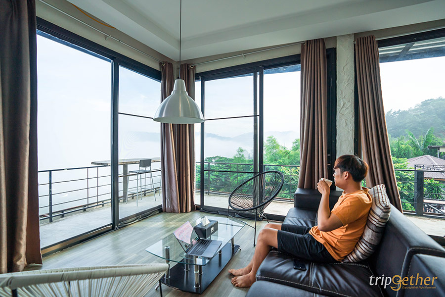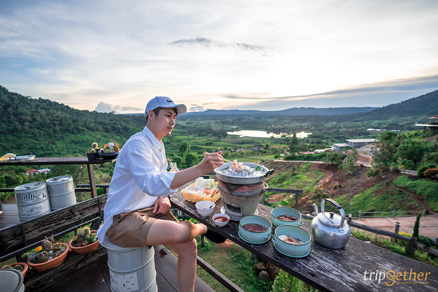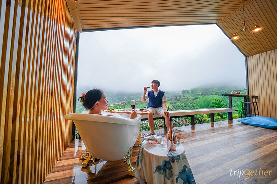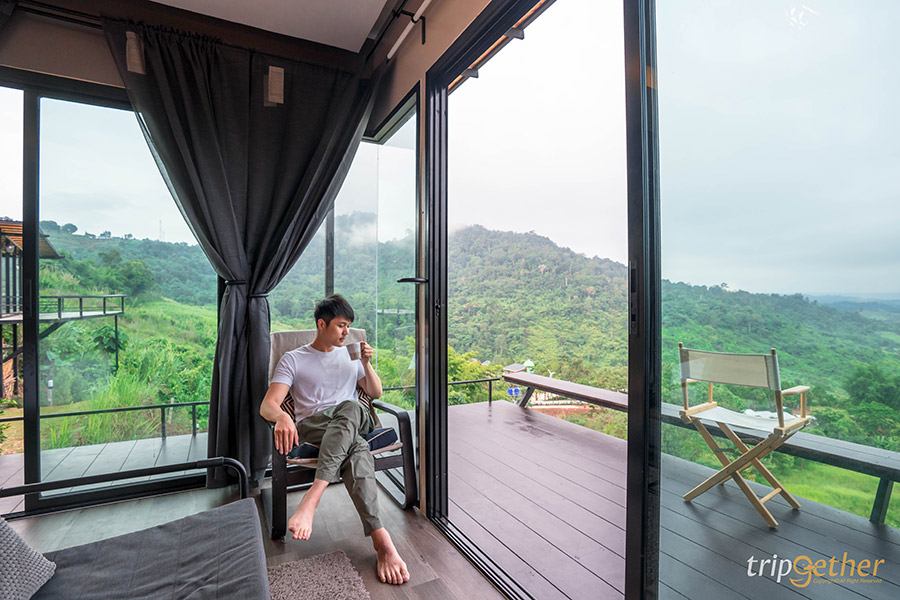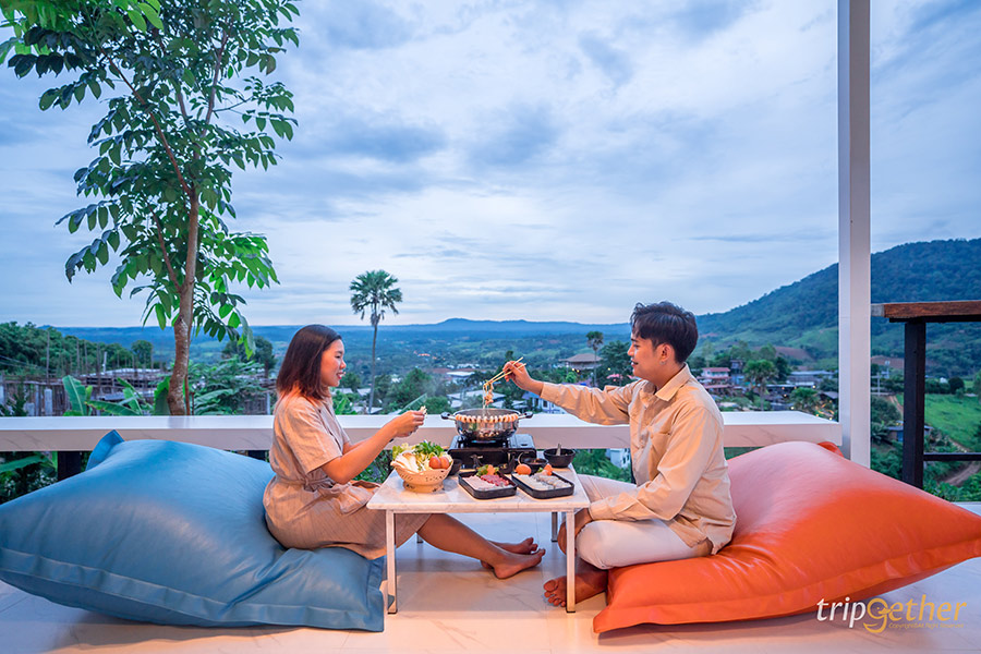 The Terrace View Resort Khaokho ที่พักเขาค้อสไตล์นอร์ดิก ตั้งอยู่บนเนินเขาสูงที่สามารถมองเห็นความอุดมสมบูรณ์ของป่าไม้ได้แบบเต็มๆ ตา อีกทั้งห้องพักแต่ละห้องถูกสร้างบนเนินที่มีความสูงลดหลั่นกันไป ทำให้ไม่ว่าจะพักห้องไหนก็ไม่ต้องกลัวว่าจะไม่เห็นวิวทิวทัศน์ บวกกับหน้าห้องพักมีระเบียงกว้างให้ได้นั่งชิลล์หรือทำกิจกรรมต่างๆ ห้องพักมีให้เลือกหลายแบบพร้อมกับวิวภูเขาแบบ 180 องศา ใครสายคอนเทนต์อยากได้รูปเก๋ๆ ก็มีอ่างอาบน้ำริมระเบียงให้ได้รับลมเย็นๆ แช่น้ำเคล้าสายหมอก หรือจะเปลตาข่ายกับวิวพื้นหลังเป็นเขาเขียวขจีและสายหมอกก็เริ่ดไม่แพ้กัน ส่วนมื้อเย็นต้องสั่งชาบูร้อนๆ มากินที่ระเบียงห้อง บอกเลยว่าดีต่อใจสุดๆ