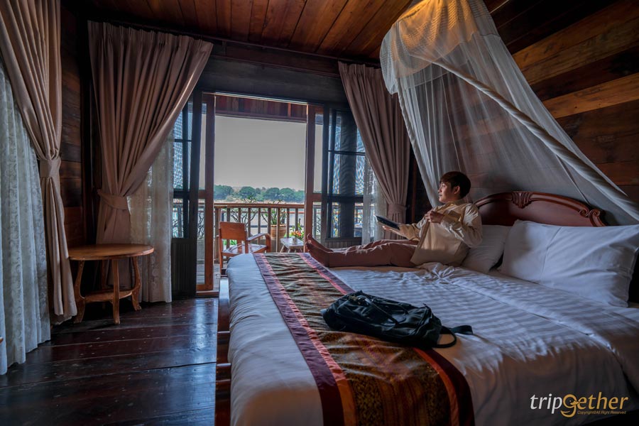มาต่อกันที่ บ้านสุพิชญา (BaanSupichaya) ที่พักเชียงคานริมโขง ด้านหน้าติดถนนคนเดิน ด้านหลังเป็นวิวแม่น้ำโขงอันกว้างไกล ตัวที่พักมาในสไตล์บ้านไม้ 2 ชั้นเก่าแก่ที่มีการตกแต่งผสมผสานดีไซน์ให้เข้ากับยุคสมัย ที่นี่มีห้องพักหลายห้อง มีทั้งห้องพักวิวถนนคนเดิน และห้องพักวิวแม่น้ำโขง มีระเบียงส่วนตัวสำหรับนั่งเล่น นอนชิลล์ชมบรรยากาศริมแม่น้ำโขง ซึ่งห้องพักทุกห้องมีสิ่งอำนวยความสะดวกให้ครบเลย ในตอนเช้าก็จะมีกิจกรรมตักบาตรข้าวเหนียวบริเวณหน้าที่พัก และในตอนเย็นบนถนนหน้าที่พักก็จะเป็นถนนคนเดินเชียงคานที่มีทั้งของกิน เสื้อผ้าต่างๆ มาวางขายเพียบ! เรียกได้ว่าเป็น ที่พักเชียงคานริมโขง ที่ทำเลปังสุดๆ