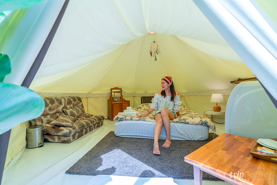 เดอะ กระโจม แก่งกระจาน ที่พักแบบเต็นท์กระโจมที่ตั้งอยู่ท่ามกลางธรรมชาติในจังหวัดเพชรบุรี มาพร้อมกับที่พักติกริมน้ำที่เป็นเต็นท์กระโจมจำนวน 15 หลัง แต่ละหลังถูกวางและจัดสรรพื้นที่อย่างดี เห็นแล้วสบายตาและเข้ากับสภาพแวดล้อม ตัวเต็นท์ถูกตกแต่งมาในสไตล์โบฮีเมี่ยน เน้นโทนสีขาวครีม ทำให้ดูอบอุ่นน่าพักผ่อน ภายในเพียบพร้อมไปด้วยเตียงนอน โต๊ะ และเฟอร์นิเจอร์มากมาย รวมถึงห้องน้ำส่วนตัว เรียกว่าถึงจะเป็นที่พักแบบเต็นท์แต่ก็สะดวกสบายไม่แพ้แบบห้องพักปกติ อีกทั้งยังมีบริการอาหารเช้า และกิจกรรมล่องเรือยางให้ได้เล่นสนุกกันตลอดการพักผ่อน