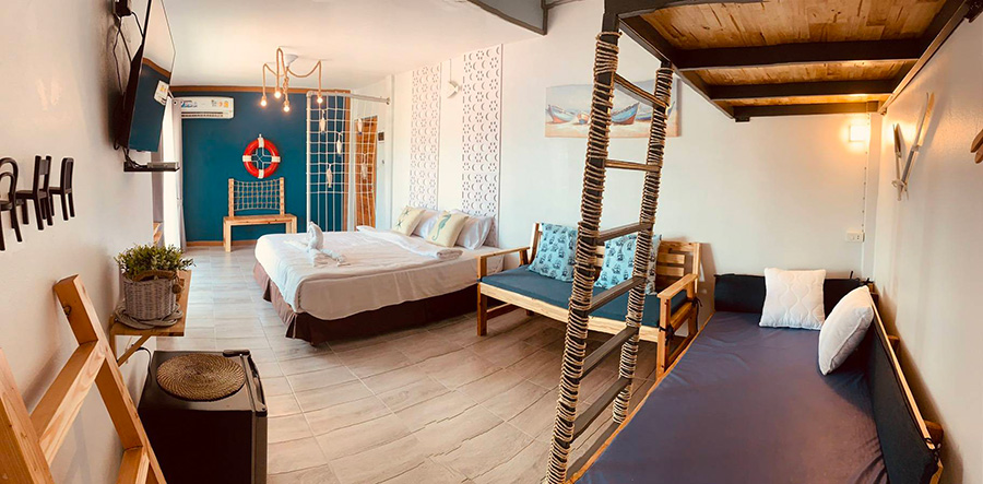 บ้านกะลาสี ที่พักในหมู่บ้านชุมชนแสมสารห่างจากท่าเรือดำน้ำ 80 เมตร ตกแต่งอย่างมีสไตล์ในธีมชาวเรือทั้งภายนอกและภายในที่มองแล้วสะดุดตา มาพร้อมพร็อพแบบจัดเต็มให้ความรู้สึกเหมือนชาวเลแบบสุดๆ ส่วนของห้องพักยังมีชื่อเท่ๆ อย่างห้องสะพานเดินเรือ ห้องถือท้าย ห้องสมอ ห้องแผนที่ ห้องเข็มทิศ ห้องหางเสือ ห้องเครื่องจักร ห้องกระซับ ห้องวิทยุ ห้องเรดาร์ ห้องโซนาร์ และห้องโถง ซึ่งแต่ละห้องตกแต่งอย่างสวยงามคุมโทนชาวเรือแบบสุดๆ ไม่เท่านั้นที่บ้านกะลาสียังมีไฮไลท์อย่างดาดฟ้าให้ขึ้นไปรับลม นั่งชิลล์ และชมวิวทะเล ใครชื่นชอบบรรยากาศยามเย็นช่วงพระอาทิตย์ตกจากมุมดาดฟ้าสามารถมองเห็นวิวท้องฟ้ากำลังเปลี่ยนสีได้แบบโรแมนติก และสำหรับคนที่ต้องการไปทริปดำน้ำ ตกหมึก ตกปลา ที่พักก็มีบริการเสริมสามารถแจ้งได้สะดวกสบายมากๆ แอบกระซิบว่าบ้านกะลาสีอยู่ห่างจากหาดน้ำใสเพียง 2 กิโลเมตรเท่านั้น สามารถไปเดินหาดทรายชิลล์ๆ ลงเล่นน้ำทะเลใสๆ กันได้ และยังตั้งอยู่ไม่ไกลจากจุดท่องเที่ยวอื่นๆ อีกด้วย