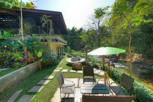 โฮมเสตย์บ้านสวนริมน้ำ เป็นอีกหนึ่งที่พักใกล้น้ำตกที่ตั้งอยู่ท่ามกลางเขาคิชฌกูฏและเขาสอยดาว มีลำธารน้ำเย็นจากน้ำตกไหลผ่านข้างที่พักพอดี ตัวบ้านพักเน้นเป็นไม้ซะส่วนใหญ่ เพื่อให้บรรยากาศดูอบอุ่นเข้ากับธรรมชาติโดยรอบ ระเบียงพื้นที่ส่วนกลางเป็นจุดชมน้ำตกที่สวยแห่งหนึ่งของที่พัก ส่วนห้องพักก็มีให้เลือกหลายแบบ จะมาเป็นคู่หรือมาเป็นหมู่คณะก็มีหมด มาพร้อมสิ่งอำนวยความสะดวกต่าง ๆ