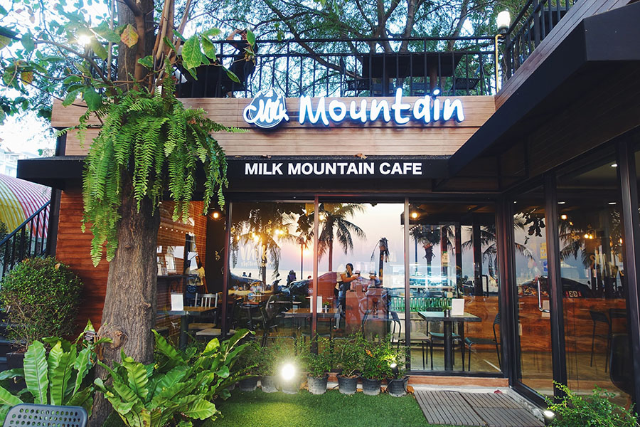 ร้านนมเอาใจสายหวาน มิลค์เม้าเท่น ขึ้นชื่อว่าเป็นร้านนมวิวทะเลแห่งบางแสนเลยทีเดียว ด้วยเมนูนมและเบเกอรี่น่าลิ้มลองมากมายหลายเมนู พร้อมเสิร์ฟในรูปแบบนมพูนๆ แบบล้นแก้ว อีกทั้งยังมีอาหารแบบทานง่ายอีกหลายเมนู สำหรับตัวร้านมิลค์เม้าเท่น ภายตกแต่งเน้นสีเอิร์ทโทนใช้ผนังปูนเปลือยผสมงานไม้ มีกระจกบานใหญ่สำหรับมองวิวทะเล และยังมีโซนที่นั่งด้านนอกบนสนามหญ้า ริมถนน สามารถมองเห็นวิวทะเลใกล้ๆ ได้เลย หรือใครอยากจะนั่งรับลมเย็นๆ ก็สามารถขึ้นไปนั่งชั้นบน ก็ชิลล์ไม่แพ้กัน