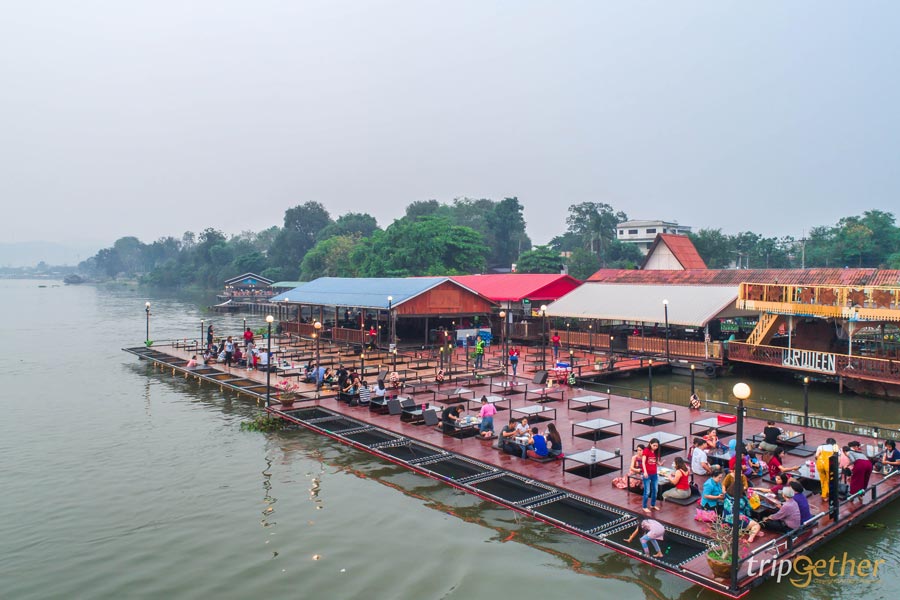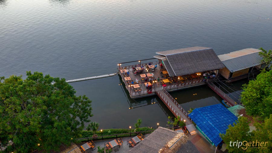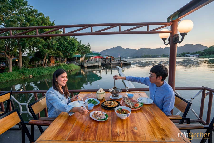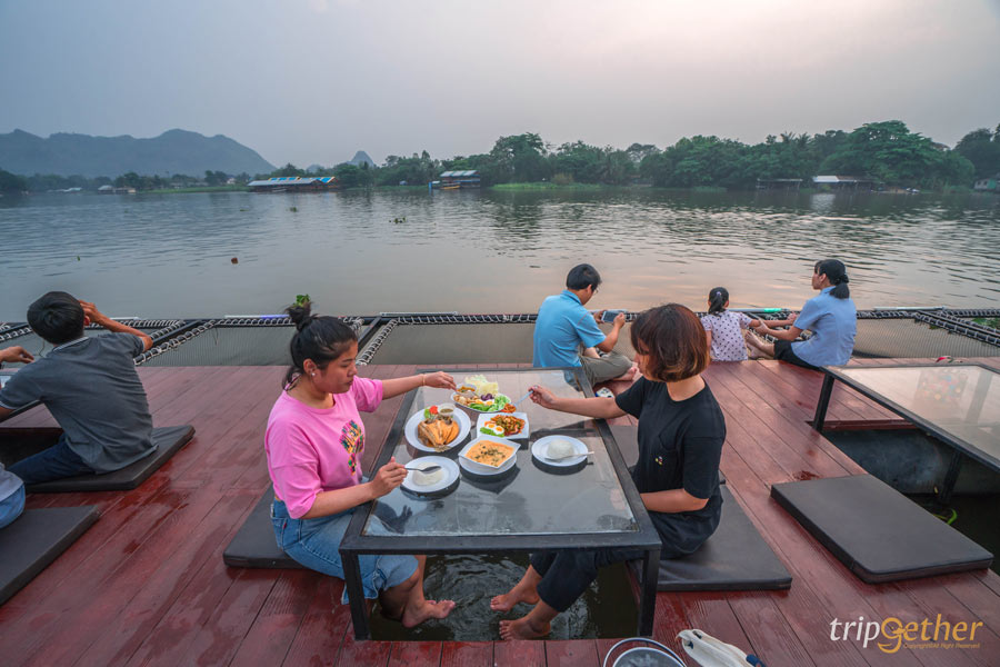 ถัดมาที่ เดชทศพักตร์การอาหาร (Dejtosapak Restaurant) ร้านอาหารบนแพ ริมน้ำ ใกล้กรุงเทพ พิกัดนี้เรียกได้ว่าเป็นร้านดังในตำนานของกาญจนบุรีเลยก็ว่าได้ ตัวร้านเป็นแพที่สร้างยื่นลงไปในน้ำ มีที่นั่งทานอาหารให้ห้อยขาจุ่มน้ำ และเปลตาข่ายให้นั่งเล่นถ่ายรูป ในส่วนของเมนูอาหารทางร้านก็มีให้เลือกหลากหลาย โดยจะเน้นเป็นอาหารไทยรสชาติจัดจ้าน สูตรเด็ดเฉพาะของทางร้าน สำหรับเมนูที่ห้ามพลาดเลยก็คือ แกงป่าเมืองกาญจน์ แกงส้มปลากดหน่อไม้ดอง และแกงคั่วหอยขม แนะนำมาช่วงเย็นๆ อากาศสบายๆ แดดไม่ร้อน