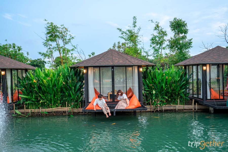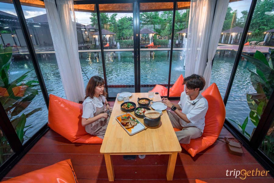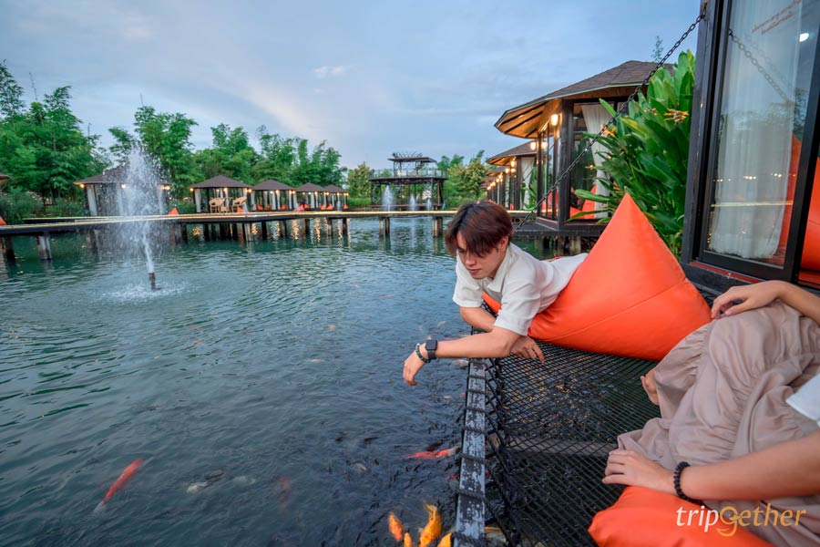 มาปิดท้ายกันที่ ม่านไผ่ สายน้ำ Cafe&Restuarant ที่นี่โดดเด่นในเรื่องของการตกแต่งให้บรรยากาศสไตล์มัลดีฟส์เบาๆ ไฮไลท์ของที่นี่คือการนั่งกินข้าวริมน้ำสบายๆ แบบเป็นส่วนตัวใน ซุ้มห้องแอร์ริมน้ำ ให้ฟีลเหมือนอยู่ในเรือนแพส่วนตัวเลยล่ะ แถมยังสามารถเปิดประตูกระจกกออกไปนั่งที่เปลตาข่าย ห้อยขาสบายๆ โพสต์ท่าถ่ายรูปชิคๆ และให้อาหารปลาคาร์ฟได้อีกด้วยนะ ในส่วนของเมนูอาหารก็เรียกได้ว่าจัดเต็มทั้งอาหารไทยฟิวชั่น อาหารอีสาน ของกินเล่น เครื่องดื่มและขนมหวาน