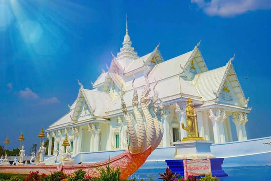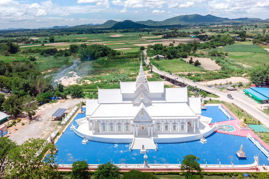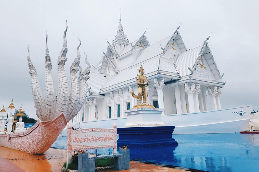 วัดหินแท่นลำภาชี จ.กาญจนบุรี วัดที่ใครขับรถผ่านไปมาต้องสะดุดตาไปกับ ‘อุโบสถสำเภาแก้วร้อยล้าน’ หนึ่งเดียวในโลกที่ประดิษฐานอยู่บนเรือหงส์ หมายถึง พระพุทธเจ้าเป็นผู้ทรงพระคุณอันประเสริฐเปล่งประกายไปทั่วโลกมนุษย์และจักรวาล นอกจากนี้ยังมีรูปปั้นของสมเด็จพระพุฒจารย์โต พรหมรังสีองค์ใหญ่สีทองตั้งตระหง่านอยู่บริเวณหน้าอุโบสถ บริเวณโดยรอบวัดยังรายล้อมไปด้วยทัศนียภาพที่สวยงามของขุนเขาอันเขียวขจี เป็นอีกหนึ่งวัดสวยเมืองกาญจนบุรีที่บอกเลยว่าต้องแวะไปสัมผัสให้ได้เลย