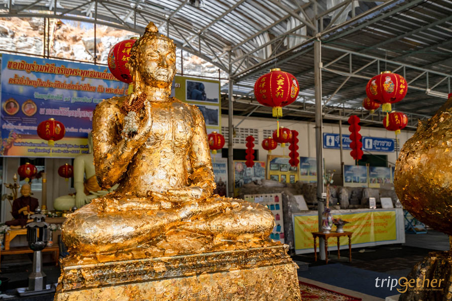 เพียงเข้ามาใกล้วัดถ้ำเสือ ก็จะสะดุดตากับพระพุทธรูปปางประทานพรหรือหลวงพ่อชินประทานพรประดิษฐานอยู่บนเนินเขา ประดับด้วยสีทองอร่ามทั้งองค์ สูงกว่า 18 เมตร มีเรือนแก้วครอบองค์พระ สวยงามและโดดเด่นเป็นอย่างมาก เรียกได้ว่าเป็นวัดชื่อดังของจังหวัดกาญจนบุรี จากตัววัดสามารถมองเห็นได้ทั้งผืนนาสีเขียวชอุ่ม แม่น้ำกลองที่ทอดยาวผ่านด้านหน้าของวัด และเนินเขามากมาย ได้ทั้งไหว้พระและชื่นชมความสวยงามของธรรมชาติไปพร้อมๆ กัน โดยสามารถขึ้นมาสักการะได้ 2 วิธีด้วยกัน คือเดินขึ้นบันไดหรือนั่งรถรางไฟฟ้า