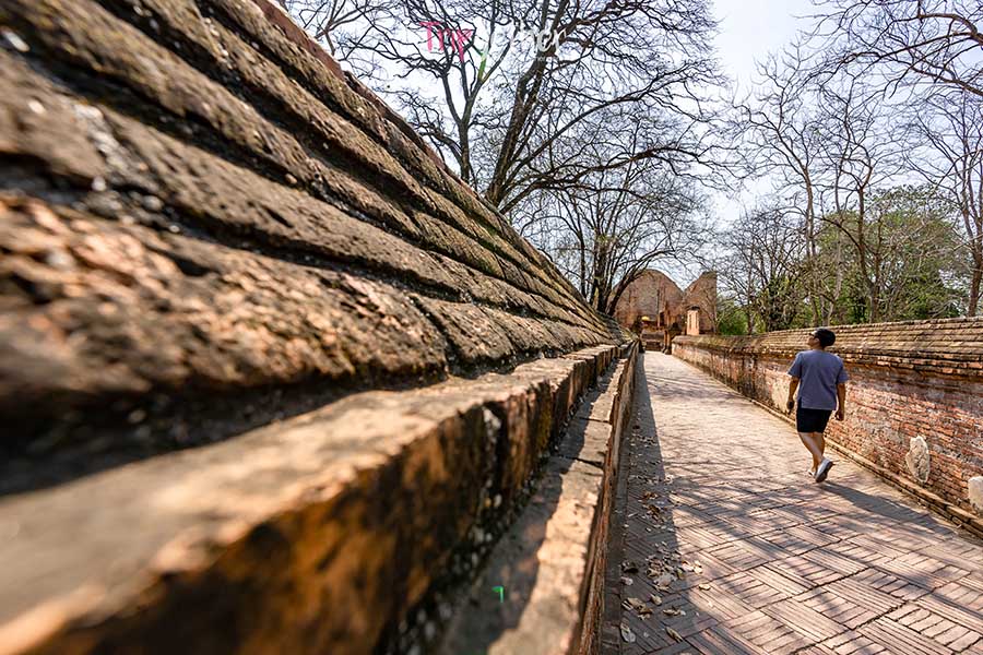 Highlight: กำแพงอิฐทางเดินระหว่างซุ้มประตูและพรุอุโบสถที่ปกคลุมด้วยมอส