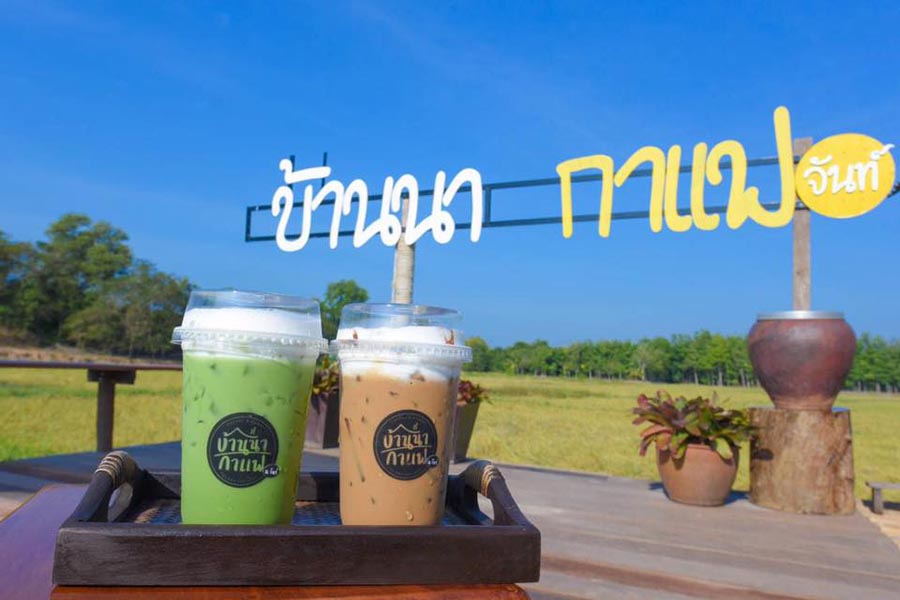 บ้านนากาแฟ ณ จันท์ อีกหนึ่งคาเฟ่น้องใหม่กลางทุ่งสีเขียว ซึ่งความพิเสษของที่นี่คือมีสะพานไม้ที่ทอดยาวไปกลางนา ได้ฟีลแบบอยู่ภาคเหนือกันเลย ส่วนตัวร้านเป็นบ้านหลังน่ารักที่ที่มีบาร์กลิ่นหอมฟุ้ง และมุมนั่งก็จะกระจายไปทั่วบริเวณ มีทั้งในห้องแอร์ กระท่อมปลายนา ศาลาไม้ไผ่ อากาศเย็นสบายตลอดทั้งวัน และเมนูร้านนี้ก็มีทั้งของคาวอย่างสเต็ก เบเกอรี่และเครื่องดื่มทั้งร้อนและเย็นให้จิบมากมาย เป็นอีกร้านที่สายเซลฟี่ไม่ควรพลาด จะช็อตไหนก็สวยฟิน