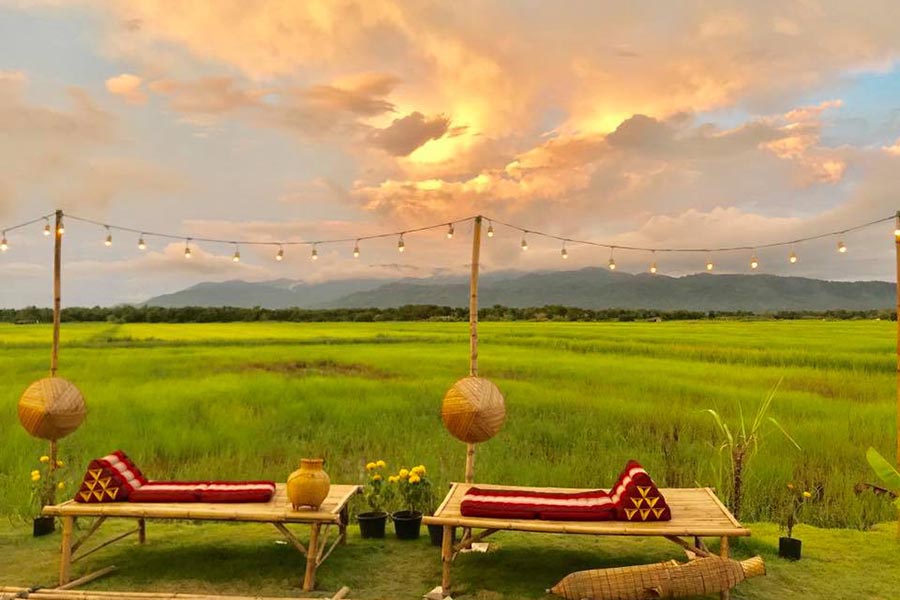 ใครจะรู้ว่าอย่างเมืองจันท์ จังหวัดแห่งผลไม้แบบนี้ก็มีคาเฟ่ริมท้องนาให้ชิลล์ด้วย จันท์ลั่นทุ่ง ร้านนี้บอกเลยว่าบรรยากาศชิลล์มาก ได้ฟีลบ้านนาสุดๆ ตัวร้านเป็นบ้านหลังน่ารักที่ตั้งเด่นอยู่ทุ่งนาสีเขียวและบ่อนำ้เล็กๆ ซึ่งรอบด้านโอบล้อมด้วยวิวภูเขา ภายในบ้านมาในโทนสีเข้มดูวินเทจ มีมุมโซฟาให้เลือกจับจองมากมาย ส่วนด้านนอกมาแบบเอาใจสายชิลล์ เป็นกระท่อมปลายนาและแคร่ไม้ไผ่ ส่วนเมนูร้านนี้ก็เด็ดดวงไม่เบา เสริฟกันเป็นแบบปิ่นโตได้ฟีลแบบห่อข้าวมาทำนา ซึ่งเมนูก็มีทั้งของคาว ของหวาน และก็เครื่องดื่ม