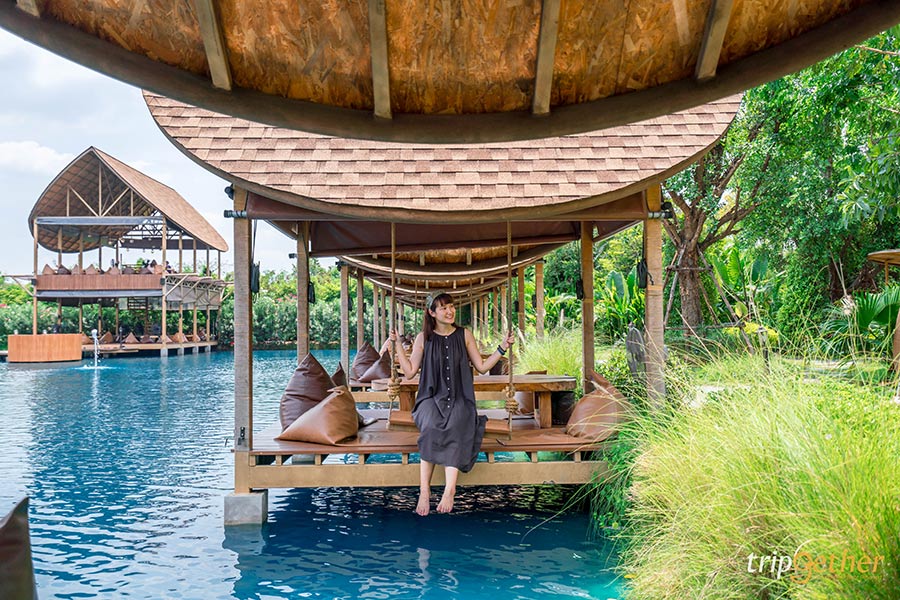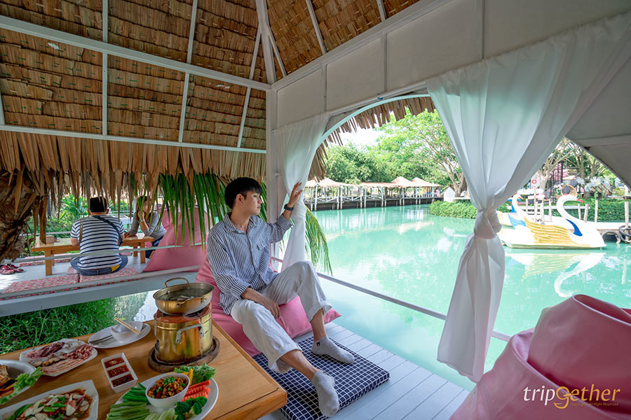 The wild swans lake & restaurant ร้านท่ามกลางบรรยากาศของผืนน้ำสีฟ้าสุดละมุ่น มองไปทางไหนก็ดูผ่อนคลาย สบายตา สำหรับตัวร้านมีการตกแต่งและคอนเซ็ปต์มาจากนิทานเรื่องเจ้าหญิงหงส์ขาว โซนที่นั่งเป็นแบบโอเพ่นแอร์มีให้เลือกหลากหลายมุมทั้งซุ้มที่นั่งส่วนตัวรอบสระน้ำ บาร์ริมสระน้ำ ที่นั่งติดท้องนา นอกจากนี้ยังมีมุมเช็คอินถ่ายรูปสวยๆ บนเกาะกลางน้ำที่จำลองบรรยากาศออกมาเหมือนโลกนิทาน ซึ่งบนเกาะนี้เป็นบ้านเหล่าสัตว์น้อย ไม่ว่าจะเป็นเป็ดน้อยและกระต่ายน่ารักๆ อีกทั้งกิจกรรมก็มีให้ทำมากมาย อย่างให้อาหารปลาและปั่นเรือเป็ด เมนูอาหารก็มีเสิร์ฟแบบครบทั้งอาหารคาว ขนมหวาน และเครื่องดื่ม