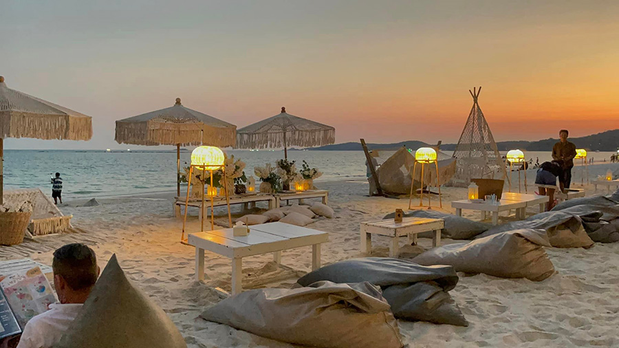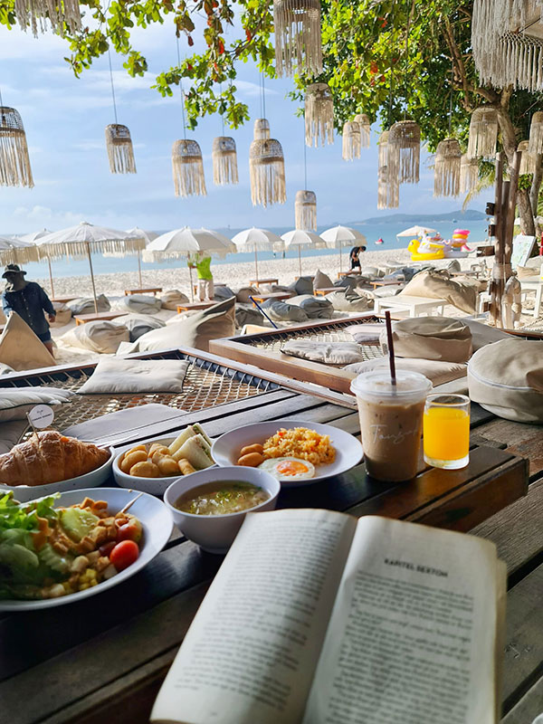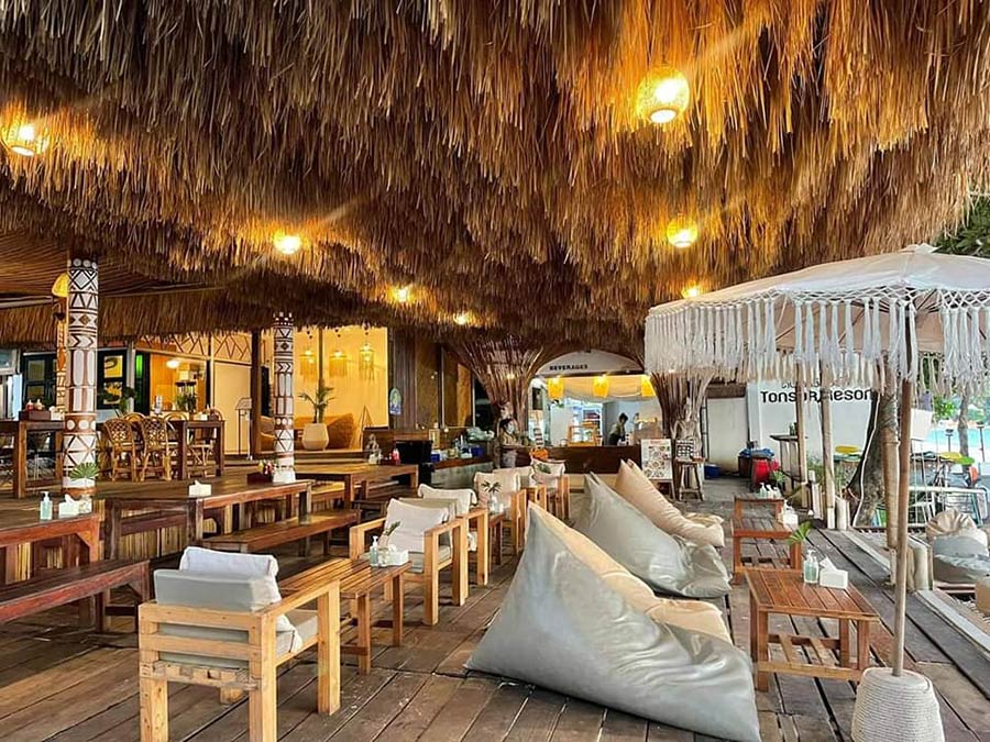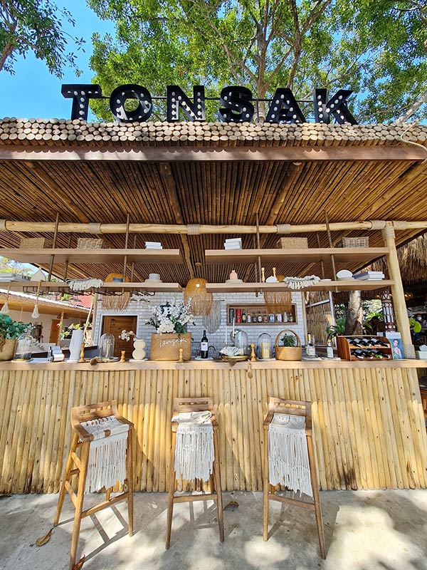 Tonsakresort Samed คาเฟ่สวยมาในสไตล์บีชบาร์ จัดเต็มมุมถ่ายรูปตั้งแต่ทางเดินเข้าร้าน เรียกได้ว่าตัวร้านเด่นและเป็นเอกลักษณ์จนใครเห็นก็อดไม่ได้เดินเข้ามาเช็คอิน ในร้านตกแต่งเข้ากับบรรยากาศของท้องทะเลโดยเน้นใช้วัสดุจากธรรมชาติและเลือกใช้สีเพียงแค่ไม่กี่สี ดูแล้วเรียบง่ายกลมกลืนกับสภาพแวดล้อม ส่วนที่นั่งเป็นแบบโอเพ่นแอร์ที่เปิดกว้างเห็นวิวทะเลอย่างใกล้ชิด สำหรับที่นั่งยอดฮิตก็หนีไม่พ้น บีนแบคบนหาดที่นอกจากจะถ่ายรูปสวยแล้วยังได้เหยียบทรายนุ่มๆ ใกล้กับน้ำทะเลสุดๆ บอกเลยว่าใครที่มานอกจากจะได้รูปสวยอัปโซเชียล ยังสามารถมานั่งพักผ่อนชิลล์ได้ด้วย