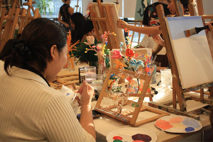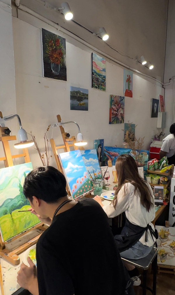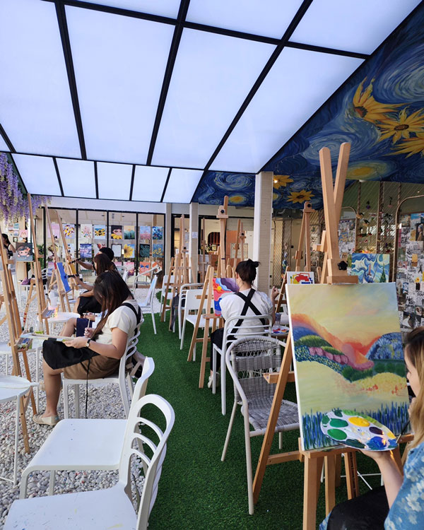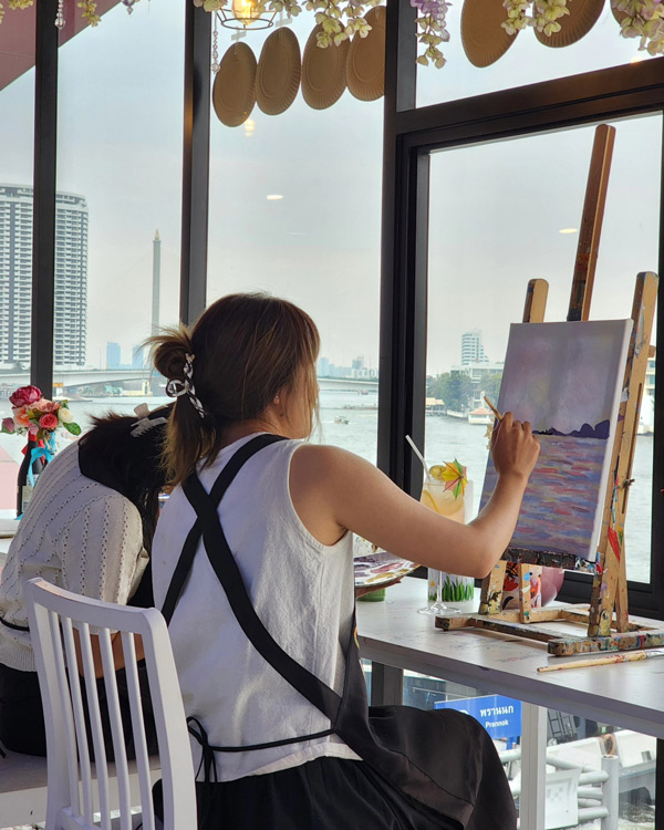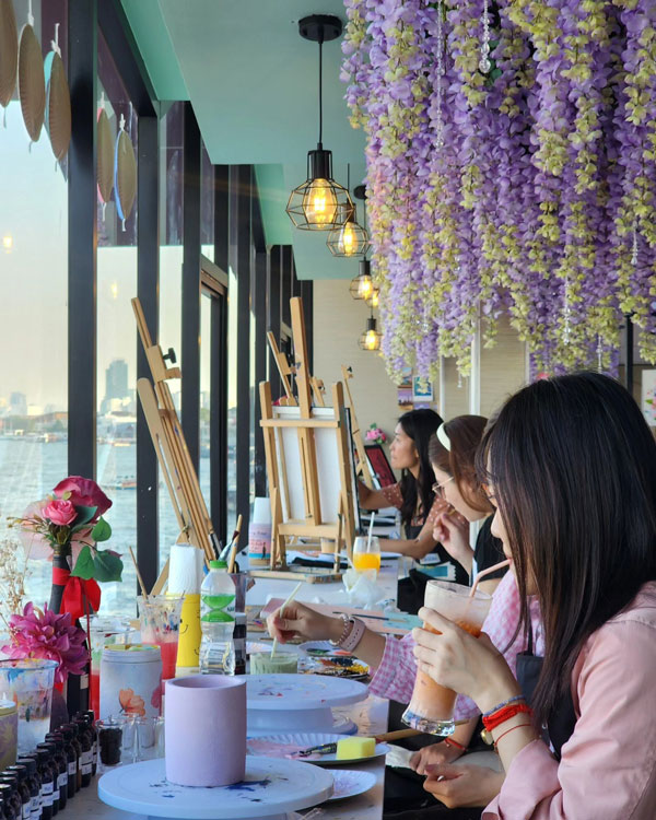 Sapore dell Arte แลนด์มาร์ค Art Space ใจกลางมหานครกรุงเทพฯ ติดแม่น้ำเจ้าพระยา บรรยากาศดีมาก ภายในร้านมีการตกแต่งให้เหมือนกับอยู่ท่ามกลางธรรมชาติ จิบกาแฟนั่งมองวิวแม่น้ำเพลินๆ เป็นแรงบรรดาลใจในการรังสรรค์ผลงานศิลปะสุดๆ Workshop ของที่ร้านจะเป็นงานเพ้นท์ โดยทางร้านมีอุปกรณ์ในการเพ้นต์ครบครันทุกอย่างเลย แถมมีพี่ๆ ศิลปินคอยให้คำแนะนำทุกขั้นตอน ไม่จำกัดเวลาในการเพ้นต์ และไม่จำกัดแบบด้วยนะ เรียกได้ว่านอกจากจะได้ดื่มด่ำไปกับบรรยากาศวาดรูปสุดผ่อนคลาย ยังได้ชมวิวแม่น้ำเจ้าพระยาอีกด้วย