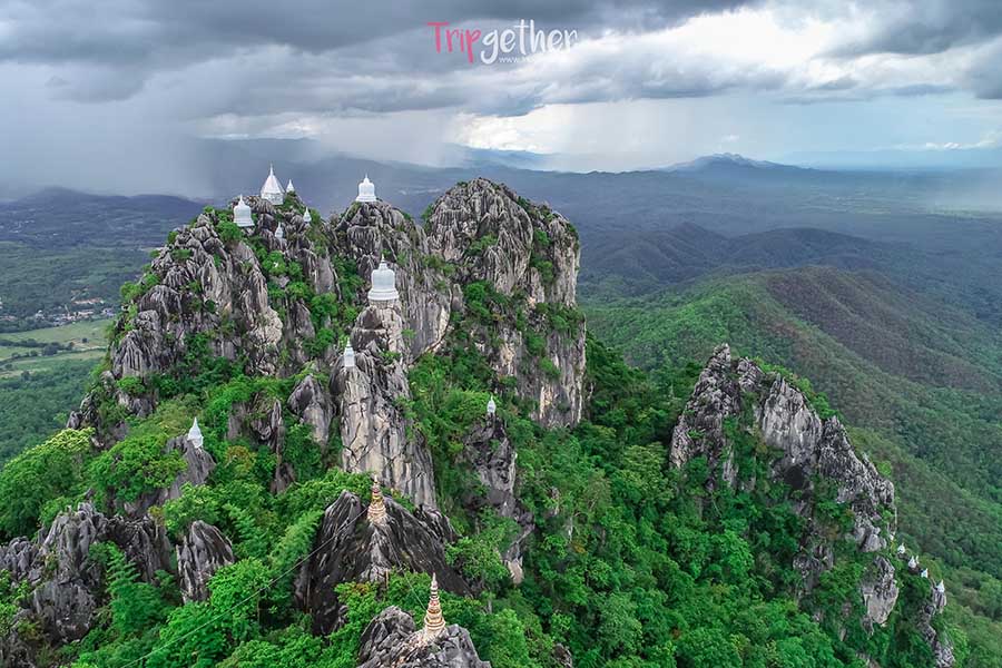 และอีกหนึ่งวัดสวย ที่เรียกว่าเป็นจุดเช็คอินสุดอันซีนของลำปางเลย วัดเฉลิมพระเกียรติพระจอมเกล้าราชานุสรณ์ หรือให้ชื่อเดิม วัดพระพุทธบาทปู่ผาแดง วัดนี้ตั้งอยู่บนยอดเขาสูงที่สร้างจากแรงศรัทธาของชาวบ้าน ซึ่งการเดินทางต้องใช้บริการรถโฟร์วีลของชาวบ้าน และเดินเท้าขึ้นเขาอีกประมาณ 1 กิโลเมตร เรียกเหงื่อได้ไม่น้อย ด้านบนบรรยากาศเย็นสบาย มีวิวให้ชมกันแบบ 360 องศา และจุดไฮไลท์ก็คือเจดีย์สีขาว ที่เรียงรายเหนือหินได้อย่างอัศจรรย์ ถูกยกให้เป็น 10 อันดับ Unseen Thailand ที่ครั้งนึงในชีวิตต้องมาเยือนสักครั้ง
