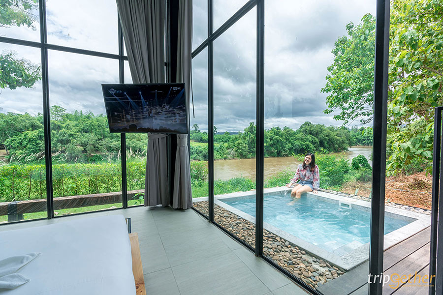 Cross River Kwai ที่พักดีไซน์สวยในสไตล์โมเดิร์นลักชัวรี่ โดดเด่นทั้งภายนอกและการออกแบบภายในที่ลงตัว ตั้งอยู่ริมน้ำให้ความรู้สึกถึงการพักผ่อนที่เงียบสงบ สำหรับครอบครัวหรือแก๊งค์เพื่อนที่มองหาที่พักที่มีห้องใหญ่นอนได้หลายคน Cross River Kwai มีพูลวิลล่าแบบ Fallingwater Pool Villa ทั้งแบบ One Bedroom และ Two Bedroom ให้เลือกเช็คอิน ภายในมาพร้อมน้ำตกและสระว่ายน้ำทั้งแบบ indoor และ outdoor ให้เล่นน้ำอย่างเพลิดเพลินไปพร้อมกับมองวิวแม่น้ำและภูเขาแบบเต็มๆ บอกเลยว่าสุดไพเวทเหมาะกับทริปพักผ่อนของเพื่อนหรือครอบครัวเป็นที่สุด