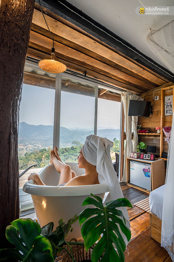 มาต่อกันที่ที่พักสุดชิคที่สายฮิปต้องบอกต่อกันอย่าง เมจิก เมาน์เทน ที่พักที่ตกแต่งด้วยสไตล์กึ่งรัสติกที่ตั้งอยู่บนเนินเขาหันหน้าออกสู่วิวสุดอันซีน สำหรับห้องพักของที่นี่มีเพียง 2 ห้องเท่านั้นและยิ่งไปกว่านั้นคือที่นี่รับลูกค้าเพียงวันละกรุ๊ป! เรียกได้ว่าเอ็กซ์คลูซีฟสุดๆ ใครที่กำลังมองหาสถานที่สุดโรแมนติกสำหรับพาแฟนมาฮันนีมูนบอกเลยที่นี่ตอบโจทย์สุดๆ ภายในห้องพักก็ตกแต่งได้อย่างน่ารักในสไตล์วินเทจ เน้นโชว์งานไม้แบบดิบๆ และมาพร้อมสิ่งอำนวยความสะดวกครบครันไม่ว่าจะเป็น ทีวี พัดลมไอเย็น ตู้เย็นและของตกแต่งกระจุกกระจิกที่เอามาเป็นพร็อพสวยๆ สำหรับถ่ายรูปได้ และที่เรียกได้ว่าเป็นไฮไลท์ของที่นี่เลยก็คืออ่างอาบน้ำในห้องนอนที่สามารถนอนแช่น้ำพร้อมชมวิวหลักล้านผ่านกระจกได้แบบฟินๆ หรือยามเย็นจะออกมานั่งเล่นที่ระเบียงน่าห้องก็รับรองว่าชิลล์ๆ สุดๆ ไปเลย