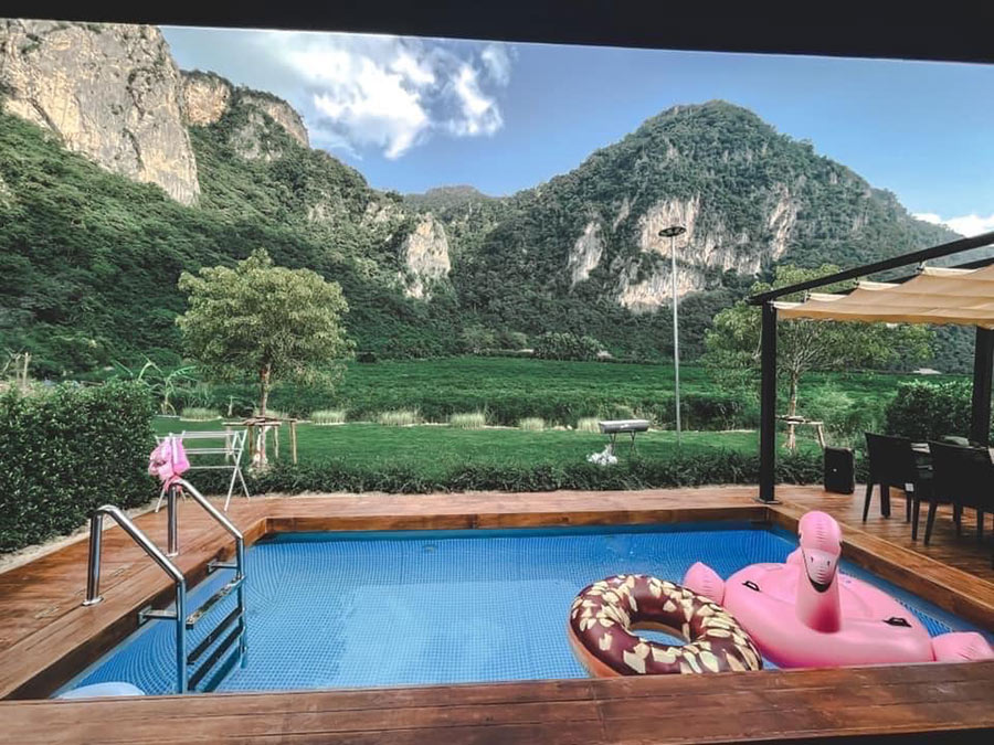 สำหรับใครมาเที่ยวแบบยกแก๊งค์ อยากได้แบบพูลวิลล่าต้องมาพักที่ At the Mountain บ้านพักสไตล์มินิมอลที่มาพร้อมกับวิวสุดอลังกาลของธรรมชาติ ตัวบ้านพักมีด้วยกันเพียงแค่ 2 หลัง โดยแต่ละหลังสามารถเข้าพักได้ 6 คน บ้านแต่ละหลังมีระเบียงหน้าบ้านและสระว่ายน้ำส่วนตัวที่หันหน้าเข้าหาวิวภูเขา มองเห็นความเขียวขจีของป่าไม้แบบใกล้ชิด เรียกได้ว่าจะนั่งชิลล์ๆ ริมระเบียง เล่นน้ำเพลินๆ หรือถ่ายรูปคู่กับวิวขุนเขาก็ปังสุดๆ เป็นที่พักที่เหมาะกับการมาเที่ยวกับครอบครัวหรือเพื่อนๆ มาก เพราะมีความเงียบสงบและมีความเป็นส่วนตัว หรือถ้ามากันแก๊งค์ใหญ่ก็เหมา 2 หลังเลยก็ได้ มาเที่ยวสนุกๆ เอ็นจอยกันสุดๆ ไปเลย