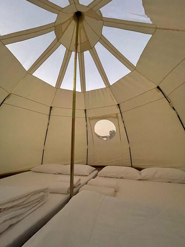 222 Mountain Camp ที่พักสไตล์ลอฟท์ ภายในที่พักกว้างขวางมีภูเขาลูกใหญ่เป็นพื้นหลังและด้านหน้ามีสนามหญ้าขนาดใหญ่ ห้องพักแบ่งออกเป็นสำหรับ 2 คนและสำหรับ 4 คน ในห้องพักมีหน้าต่างบานใหญ่รอบห้อง ทำให้ห้องดูโปร่งสบาย อีกทั้งยังสามารถเห็นวิวทิวทัศน์ธรรมชาติขุนเขาและธรรมชาติได้แบบเต็มๆ ตาจากในห้องนอน เรียกได้ว่าไม่ต้องเดินออกจากห้องพักก็นอนฟิน มองวิวจากบนเตียงได้เลย ส่วนใครอยากนอนใกล้ชิดกับธรรมชาติมากขึ้นก็สามารถพกเต็นท์มากางตรงลานกว้างก็ให้ฟีลที่ดีไม่แพ้กัน