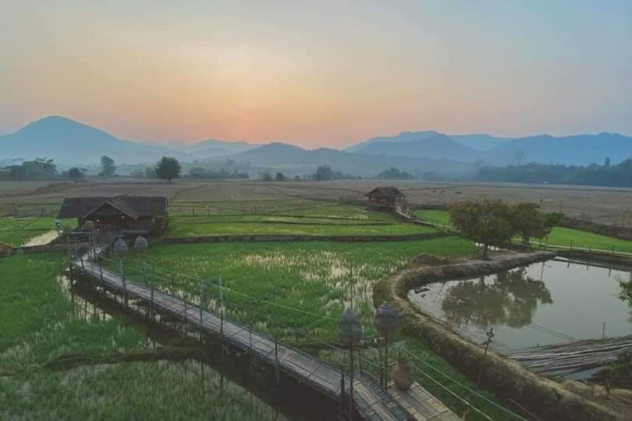 บ้านนอก ฮอกควาย (Baan Nok Hokkwaay) ที่พักเงียบสงบน่าหนีเมืองวุ่นวายไปพักผ่อน พร้อมทิวทัศน์ขุนเขาและท้องนาอันเขียวขจี มีห้องพักให้เลือก 3 แบบ มีสไตล์ที่แตกต่างกันออกไป เริ่มต้นที่ ‘แคปซูลไม้ไผ่’ บ้านพักยกสูง มาพร้อมระเบียงหน้าห้องพัก พักได้ 6 – 8 คน ต่อด้วย ‘บ้านชายทุ่ง’ บ้านพักน้อย มาพร้อมเปลตาข่ายให้นอนเล่นชิลล์ๆ รับลมเย็น พร้อมกระท่อมนั่งรับประทานอาหารแบบส่วนตัว พักได้ 1 – 2 คน ปิดท้ายด้วย ‘บ้านกลางนา’ บ้านพักที่แยกตัวออกไปอยู่กลางทุ่งนา พร้อมวิวสวย ให้ฟีลเหมือนพักผ่อนอยู่บ้านพักสุดสโลว์ไลฟ์กลางท้องนา พิเศษสุดคือมีอ่างน้ำให้นอนแช่มองวิว และมีเครื่องทำน้ำอุ่น พักได้ 4 คน ทุกหลังไม่มีเครื่องปรับอากาศเพราะอากาศที่นี่เย็นสบายมาก ไม่ต้องเปิดแอร์เลย เป็นอีกหนึ่งที่พักที่เหมาะหนีมานอนพักผ่อนหลังโควิด-19 หมดแล้วสุดๆ