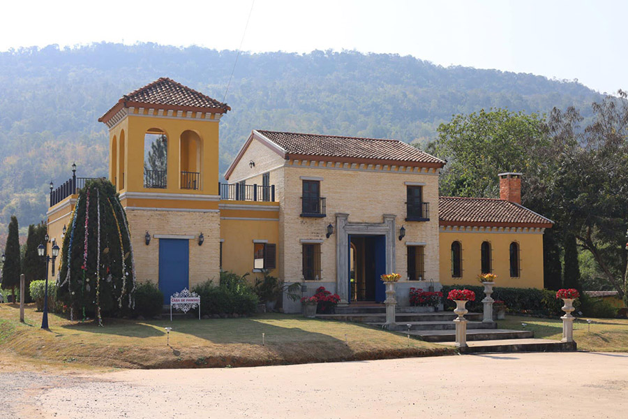 คาซ่า เดอ ปันดาว ที่พักสไตล์สเปน โดดเด่นด้วยอาคารสีเหลืองแจ่ม ภายหน้ามีสถาปัตยกรรมและบ่อน้ำพุแบบยุโรป ที่สัมผัสได้ถึงความหรูหราตั้งแต่ก้าวเข้ามายังล็อบบี้ด้วยเฟอร์นิเจอร์วินเทจ คาซ่าเดอปันดาว มีบริการคาเฟ่ในตัวรีสอร์ทด้วย สำหรับสั่งเครื่องดื่มเย็นๆ ก่อนจะเข้าห้องพัก ที่นี่มีห้องพักทั้งหมด 22 ห้อง ซึ่งมีห้องพักที่สามารถเชื่อมถึงกันได้เป็นตัวเลือกสำหรับแขกที่มากันเป็นหมู่คณะ ทุกห้องเห็นวิวภูเขาเขียวๆ ได้จากในห้อง แถมที่นี่ยังปลูกราสเบอรี่ซึ่งค่อนข้างหายากในไทย ส่วนหนึ่งทางรีสอร์ทได้นำมาแปรรูปทำเป็นแยมราสเบอรี่ คุณจึงจะได้ลิ้มรสแยมราสเบอรี่จากวัตถุดิบสดๆ แถมมีให้ซื้อกลับบ้านอีกด้วย พื้นที่สีเขียวท่ามกลางขุนเขาของคาซ่าเดอปันดาว ตั้งแต่อาทิตย์ขึ้นยันพลบค่ำให้บรรยากาศที่สวยงามจากธรรมชาติและความเงียบสงบของป่าเขา หากมาในช่วงที่เวลาที่เหมาะเจาะกับท้องฟ้าที่ปลอดโปร่งอาจจะโชคดีได้พบกับดาวระยิบระยับ เพิ่มความโรแมนติกเข้าไปอีก สมกับชื่อ คาซ่าเดอปันดาว เสียจริงๆ