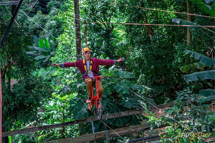 Rapsodia Park Khao Yai ที่เที่ยวสายแอดเวนเจอร์ที่มาพร้อมกับคาเฟ่ท่ามกลางความกรีนของป่าไม้ ซึ่งที่นี่มีส่วนของ Adventure Park ที่ได้รวบรวมกิจกรรมหลากหลายรูปแบบมาไว้ในที่เดียว เน้นเป็น Rope Course กิจกรรมฐานที่ได้มาตรฐานสากลจากยุโรป โดยแบ่งเป็น 2 เส้นทาง คือ Half Course ที่แบ่งออกเป็น 8 ฐาน และ Full Course ที่มีถึง 17 ฐาน มีทั้ง Air Skateboard, Zig Zag Swing, Via Ferrata โดยกิจกรรมไฮไลท์ที่สายลุยจะต้องเลิฟก็คือ Giant Zip Line ที่มีความยาวกว่า 70 เมตร และอีกเพียบ อีกทั้งในทุกๆ ฐานกิจกรรมจะมีเจ้าหน้าที่คอยให้ความดูและอย่างใกล้ชิดอีกด้วย บอกเลยว่ามาที่นี่นอกจากจะได้นั่งคาเฟ่ชิลล์ๆ แล้ว ยังได้เล่นกิจกรรมสนุกๆ แบบจัดเต็มอีกด้วย