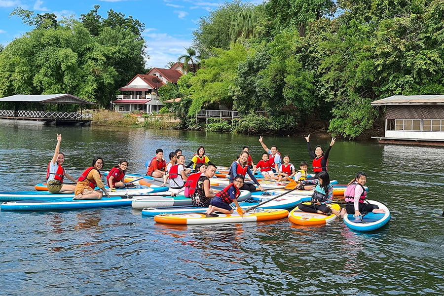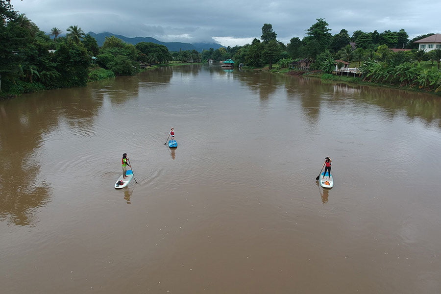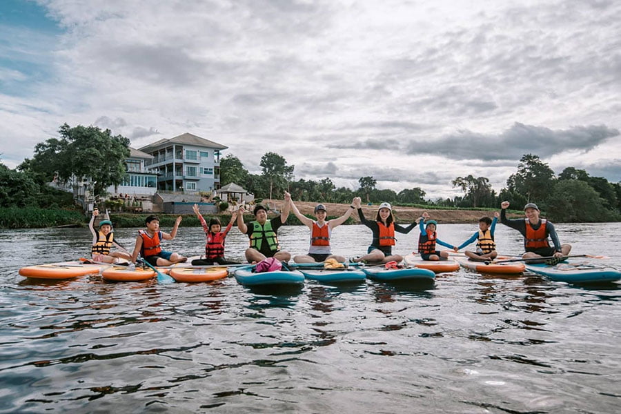 ตามมาด้วย SUP Hire Thailand แห่งเมืองกาญจนบุรี ที่มาพร้อมคลาสสอน SUP Board ตั้งแต่ขั้นพื้นฐานสำหรับคนที่ไม่เคยพายมาก่อน โดยมีให้เลือกถึง 4 เส้นทาง ซึ่งแต่ละเส้นทางพายจะมีแตกต่างกันออกไปตามความชำนาญของแต่ละคนโดยมีตั้งแต่ เส้นทางพาย 1.5 – 2 ชั่วโมง พายทั้งหมด 7 กิโลเมตร ซึ่งจะเริ่มที่ท่าน้ำรอยัล ริเวอร์แคว รีสอร์ท เพราะบริเวณนี้จะมีเกาะแก่งพายง่ายสำหรับคนเริ่มต้น แต่สำหรับคนที่โปรแล้ว สามารถเลือกพายเส้นทางน้ำตกได้ โดยเส้นทางนี้จะผ่านน้ำตกเล็กๆ 2-3 น้ำตก ไปจนถึงน้ำตกใหญ่ในระยะทาง 2.5 – 3 ชั่วโมง สามารถเริ่มเรียนได้ตั้งแต่ 06.00 น. เช้าไปจนถึงช่วงที่พระอาทิตย์ตกโดยจะเริ่มตั้งแต่ 15.00 น. โดยจะใช้เวลา 3 – 3.5 ชั่วโมง ซึ่งที่แห่งนี้เป็นอีกหนึ่งสถานที่ที่เหมาะสำหรับคนที่อยากสัมผัสธรรมชาติของขุนเขาและแม่น้ำในสไตล์ชิลล์ๆ เอาเป็นว่าใครที่อยากพักผ่อนสไตล์กีฬาทางน้ำก็แวะมาที่ SUP Hire Thailand จ.กาญจนบุรี