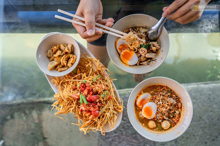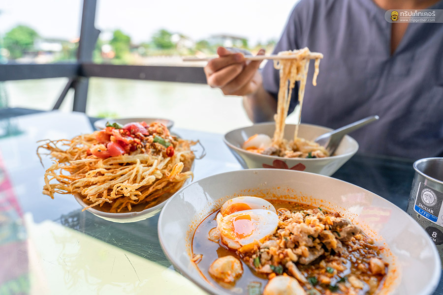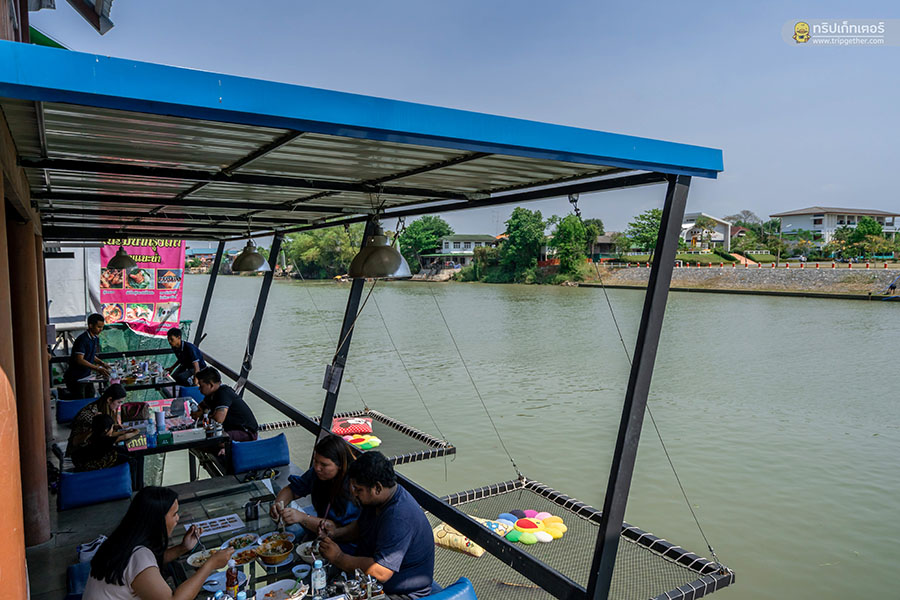 ปิดท้ายความอร่อยกันที่ร้าน ก๋วยเตี๋ยวเรือห้อยขา บาย บลูริเวอร์ ร้านก๋วยเตี๋ยวเรือห้อยขาริมแม่น้ำที่มีไฮไลท์เป็นที่นั่งไว้ให้ห้อยขากินของอร่อยๆ กันแบบชิลล์ๆ แถมยังมีลมพัดเย็นสบายตลอดทั้งวัน นอกจากเมนูก๋วยเตี๋ยวที่ว่าเด็ดสุดๆ แล้ว เมนูอื่นๆ ก็ยังเด็ดไม่แพ้กันมีทั้ง หมูสะเต๊ะ ส้มตำ ยำและลูกชิ้นปิ้ง สำหรับใครที่ไปเช็คอินกันถึงที่แล้วก็ต้องไม่พลาดกับก๋วยเตี๋ยวเรือไข่ยางมะตูมซึ่งรับรองเลยว่าอร่อยจนวางช้อนไม่ลงอย่างแน่นอน และยังมีมุมเปลตาข่ายให้นั่งชิลล์ๆ พร้อมเป็นมุมถ่ายรูปสวยๆ ที่ใครๆ ก็ต้องอยากตามมาถ่าย