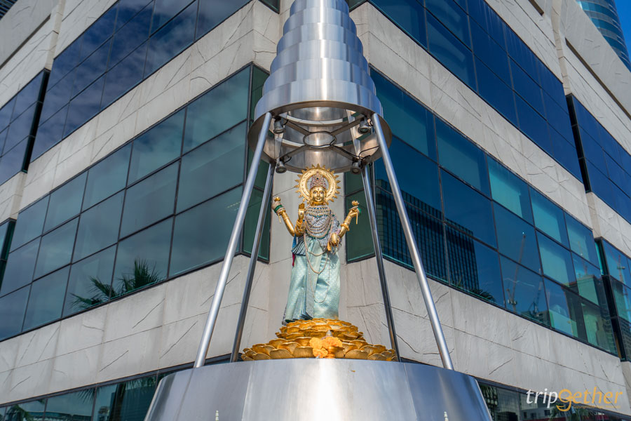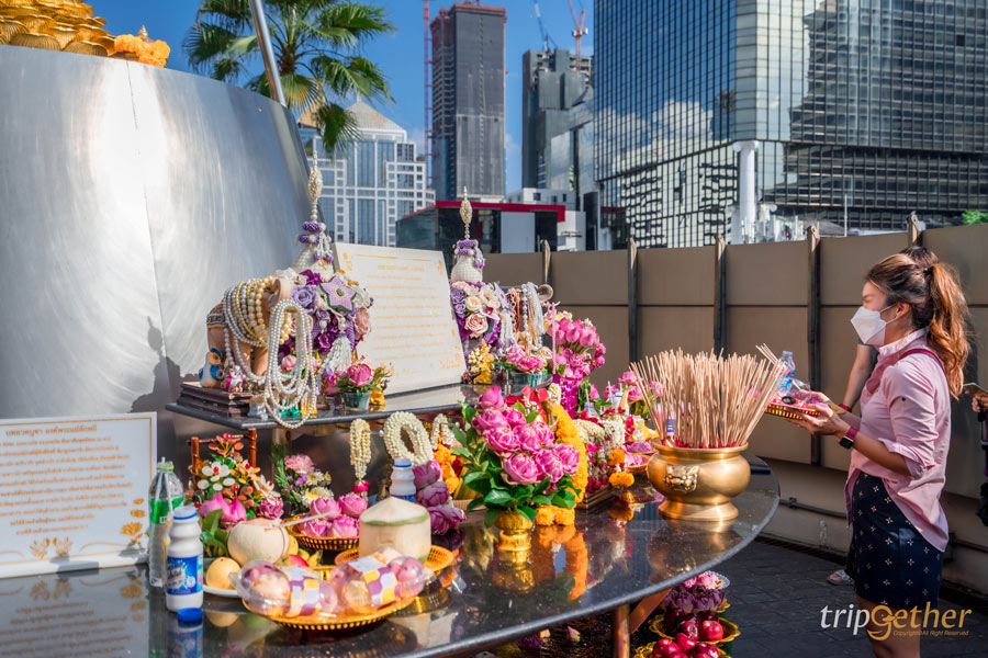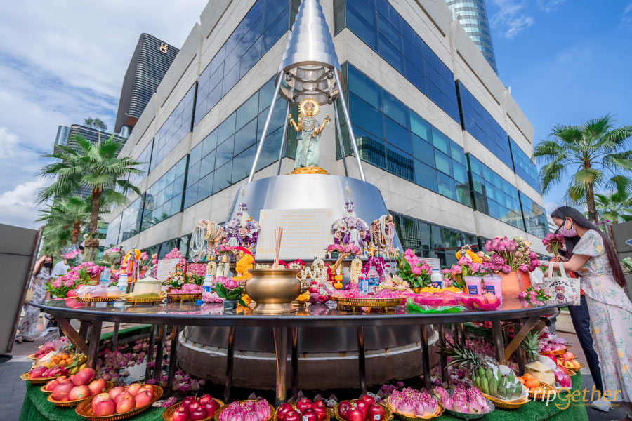 ศาลพระตรีมูรติ ลานหน้าห้างเซ็นทรัลเวิลด์ สถานที่ขอพรความรักสุดฮิตของชาวกรุงที่ขึ้นชื่อเรื่องความศักดิ์สิทธิ์แบบติดท็อป เทวรูปองค์สีทองตั้งอยู่ท่ามกลางกลุ่มคนที่ล้วนแต่มีจุดหมายเดียวกันนั่นก็คือเรื่องหัวใจ วิธีไหว้ก็ไม่ยากมากพิธี เพียงแค่ใช้ดอกกุหลาบ 9 ดอก เพราะเป็นสัญลักษณ์ของความรัก อาจจะเพิ่มน้ำแดงไปด้วยก็ได้ ซึ่งเวลาไหว้ที่เขาถือกันว่าขลังสุดๆ ก็คือตอน 9.30 น. และ 21.30 น. ถ้าใครสมหวังมีคนรักตามตั้งใจก็นำมะพร้าว อ้อย หรือของหวานอื่นๆ มาถวายอีกทีนะ และเซ็ตไหว้ทั้งหมดมีบริการอยู่ด้านหน้าเทวรูปเลย เรียกได้ว่าสะดวกสบายสำหรับคนจะมีคู่จริงๆ