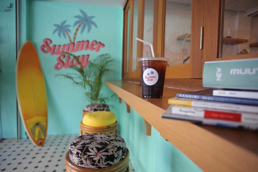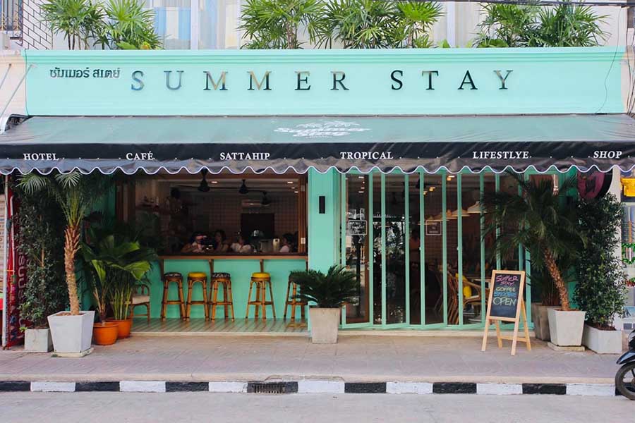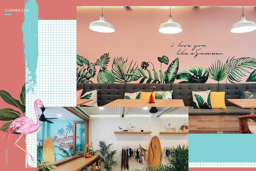 ข้ามฝั่งมาโซนสัตหีบกันบ้าง ออกสตาร์ทกับคาเฟ่น้องใหม่กันที่ ซัมเมอร์ สเตย์ ที่นี่เป็นอีกหนึ่งศูนย์กลางการพักผ่อน ที่บริการทั้งคาเฟ่ และห้องพักโฮสเทลดีไซน์สุดฮิป ตัวร้านมาในโทนสีฟ้าพาสเทลเข้ากับสีของทะเลสัตหีบ ส่วนภายในตกแต่งในสไตล์ทรอปิคอล ดูชิลล์ด้วยเฟอร์นิเจอร์สุดคราฟท์ เหมาะแก่การมานั่งพักร้อนยามบ่ายสุดๆ และแน่นอนว่าบรรยากาศร้อนๆแบบนี้ก็ต้องไม่พลาดความอร่อยฉุ่มช่ำ ซึ่งที่นี่ก็เสริฟทั้งเบเกอรี่และเครื่องดื่มสีสันสดใส รสชาติดีถ่ายรูปสวย เรียกว่าอยู่เพลินได้ตลอดทั้งวัน