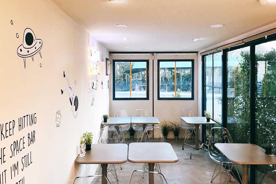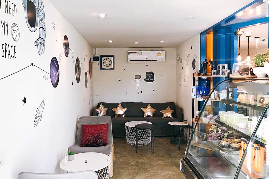 อวกาศ คาเฟ่ ร้านน่ารักๆ ขวัญใจวัยรุ่น ที่โดดเด่นในตีมแบบกาแล็คซี่สุดสนุกสนานชวนไม่เบื่อ ตัวร้านรีโนเวทจากตู้คอนเทนเนอร์เก่าๆ ให้เป็นมุมนั่งที่ตกแต่งด้วยไอเทมและเฟอร์นิเจอร์ดีไซน์ล้ำๆ และมีหน้าต่างเล็กๆ สำหรับชมวิว ให้ความรู้สึกเหมือนอยู่บนยานในห้วงอวกาศ ส่วนเมนูก็มีทั้งเมนูจานเดียว อาหารทานเล่น และเครื่องดื่ม รวมถึงความเด็ดดวงอย่างเบเกอรี่สไตล์ญี่ปุ่นสุดคาวาอิ เป็นอีกหนึ่งร้านน่านั่งที่สายหวานไม่ควรพลาดด้วยประการทั้งปวง