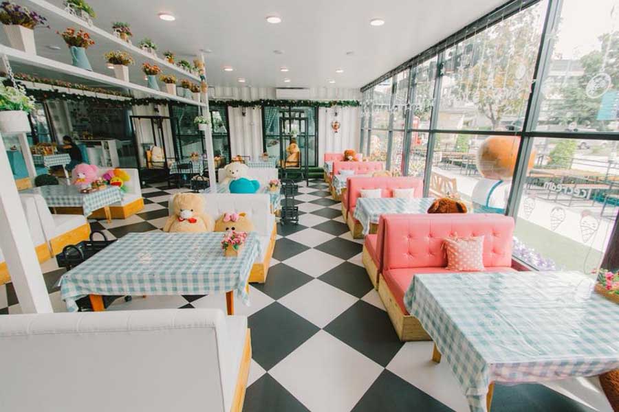คาเฟ่ บ้านหมี ร้านน่านั่งบรรยากาศเย็นสบายขวัญใจสาวหวานในย่านพุทฑมณฑลสาย 2 ตัวร้านเป็นตึกดีไซน์สุดเก๋ ที่จับเอาตู้คอนเทนเนอร์มาแปลงโฉมเป็นมุมต่างๆ มีให้เลือกทั้งอินดอร์และเอาท์ดอร์ ภายในตกแต่งในสไตล์วินเทจสีพาลเทล ที่ทุกจุดจะประดับประดาไปด้วยเหล่าตุ๊กตาเท็ดดี้แบร์สมกับเป็นหมู่บ้านมี ซึ่งเหมาะแก่การมานั่งชิลล์ถ่ายรูปสุดๆ ส่วนเมนูอร่อยบอกเลยว่าจัดเต็มทั้งคาว ไทย อีสาน ยุโรป รวมถึงเบเกอรี่และเครื่องดื่ม ที่อัดแน่นรวมแล้วกว่า 100 เมนู