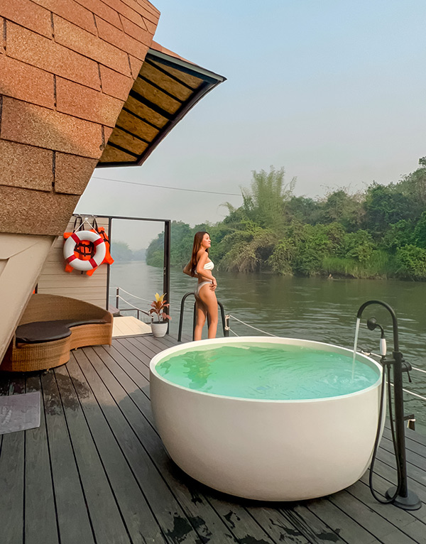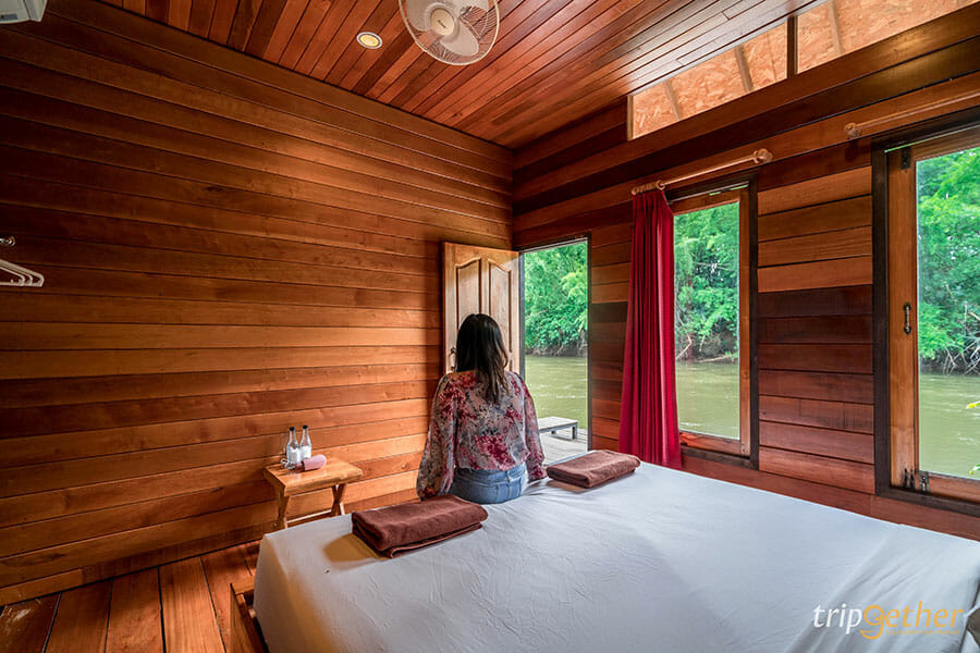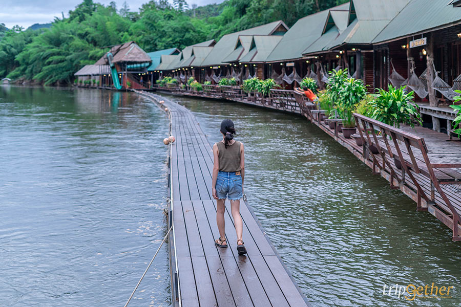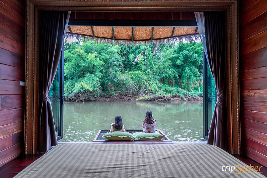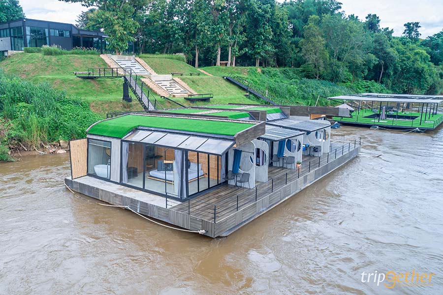 The FloatHouse River Kwai Resort วิลล่าหรูริมแม่น้ำแควน้อยกับการออกแบบสไตล์ Contemporary Boutique Folk Style ที่ผสมผสานศิลปะทางตะวันและศิลปะท้องถิ่นอย่างลงตัว จนกลายเป็นเอกลักษณ์ที่ดูหรูหราสอดคล้องไปกับธรรมชาติ วิลล่าทุกหลังตั้งอยู่บนแพริมน้ำ มีพื้นที่ใช้สอยกว่า 90 ตารางเมตร เรียกได้ว่ากว้างขวางและแบ่งสัดส่วนมาอย่างดี รวมถึงมีสิ่งอำนวยความสะดวกครบครัน มีห้องน้ำในตัว และมีระเบียงส่วนตัวให้ได้นั่งเสพธรรมชาติฟินๆ ส่วนใครอยากเล่นน้ำเย็นๆ ก็โดดลงน้ำได้จากหน้าที่พักเลย นอกจากนี้ที่พักยังมีบริการห้องอาหารลอยน้ำ “พอนทูน” พร้อมเสิร์ฟอาหารทุกมื้อ อีกทั้งยังจัดเต็มกิจกรรมทางบกและทางน้ำ ไม่ว่าจะพายเรือแคนู พายซับบอร์ด ล่องแพไม้ไผ่ ล่องเรือชมธรรมชาติ ปั่นจักรยาน และแอบกระซิบว่าห้ามพลาดจุดไฮไลท์อย่างถ้ำละว้า ที่มีหินงอกหินย้อยสุดอันซีน ซึ่งถ้ำนี้สามารถเดินจากที่พักเพียงแป๊บเดียวเท่านั้น ใครอยากมาสัมผัสความกรีนฉ่ำๆ นอนริมน้ำสบายๆ แถมมีกิจกรรมสนุกๆ ให้ทำ แนะนำ The FloatHouse River Kwai Resort รับรองมาแล้วจะติดใจ