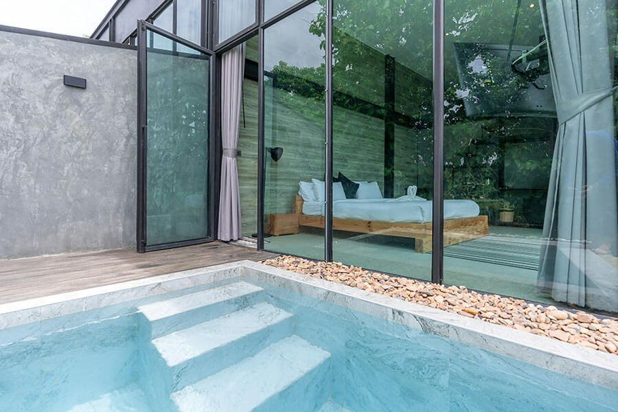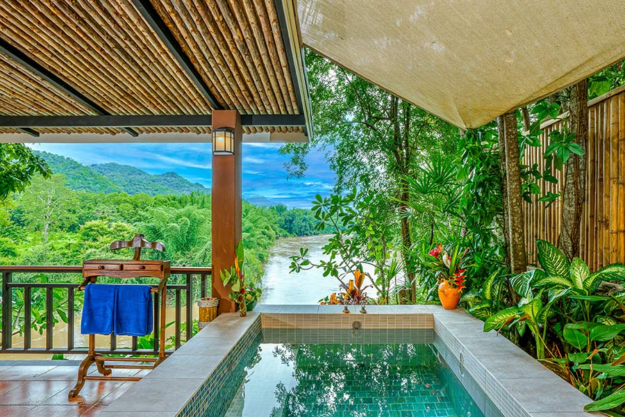The Tryst River Kwai ที่พักกาญจนบุรีริมแม่น้ำแควน้อย ตัวที่พักอยู่ท่ามกลางป่าไม้น้อยใหญ่ มีความเขียวชอุ่มอยู่รอบที่พัก ช่วยให้บรรยากาศดูผ่อนคลายและสบายตา ที่พักมีการตกแต่งสไตล์ forest loft ที่ดูสอดคล้องกับธรรมชาติรอบๆ ส่วนห้องพักมีให้เลือกมากถึง 10 แบบด้วยกัน โดยแบ่งออกเป็นห้องพักริมน้ำ 5 แบบ ซึ่งแต่ละห้องมาพร้อมกับกระจกบานใหญ่ที่สัมผัสวิวแม่น้ำได้แบบเต็มๆ ตา รวมถึงอ่างอาบน้ำที่สามารถนอนแช่น้ำเย็นๆ มองวิวทิวทัศน์เพลินๆ และห้องพักบนฝั่ง 5 แบบ ซึ่งมีทั้งแบบพูลวลิล่าและอ่างอาบน้ำให้ได้เลือกตามใจชอบ