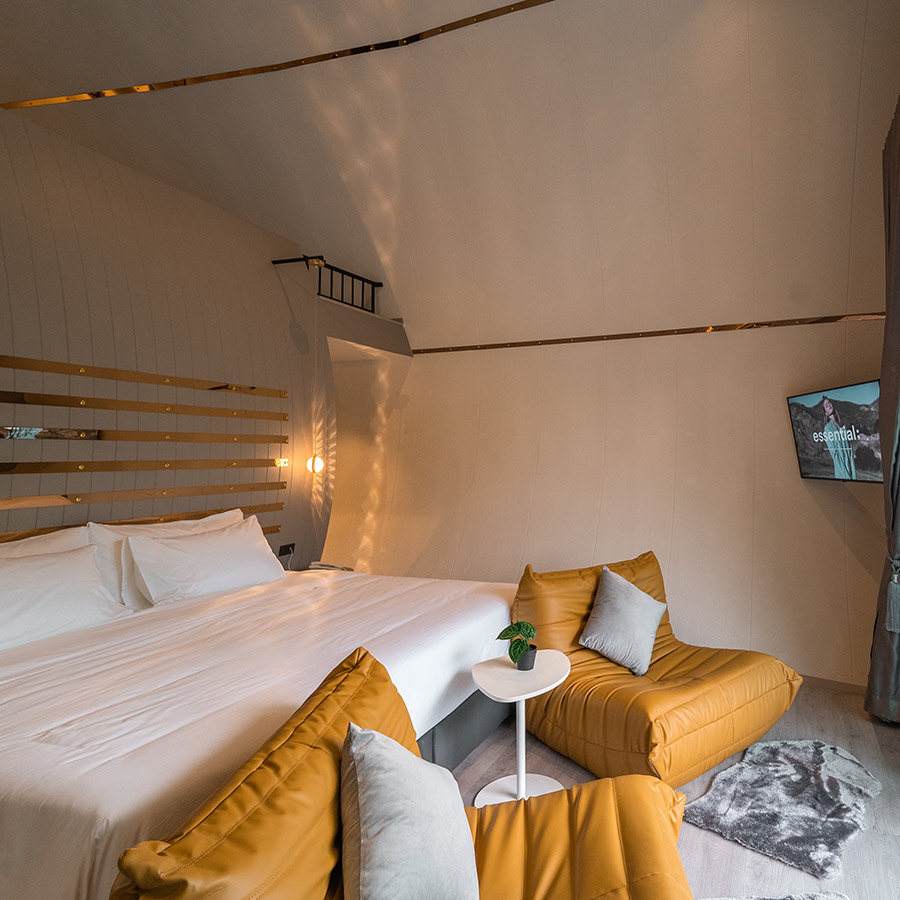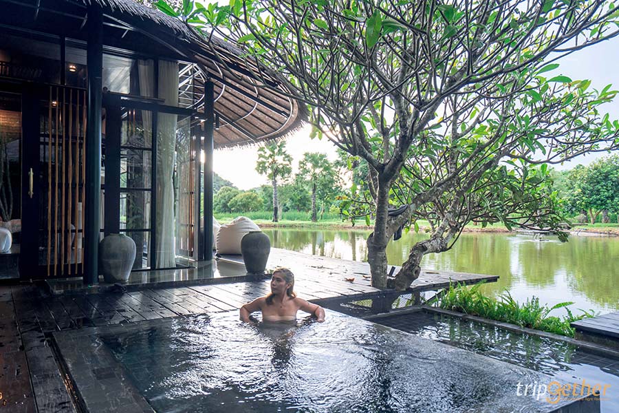 มานอนให้ธรรมชาติโอบกอดกันต่อที่ The Sense Resort Kanchanaburi ที่พักสุดหรูริมแม่น้ำแควบนพื้นที่กว่า 43 ไร่ ภายในที่พักห้อมล้อมไปด้วยธรรมชาติเขียวชอุ่ม เรียกได้ว่ามองไปทางไหนก็สบายตาและสดชื่น แถมยังสูดอากาศบริสุทธิ์ได้เต็มๆ ปอด ส่วนตัวอาคารเน้นใช้วัสดุธรรมชาติ เลือกโทนสีน้ำตาลดำที่ดูหรูหราและอบอุ่น สำหรับห้องพักมีทั้งหมด 20 หลัง แบ่งเป็น 2 ประเภทหลักๆ มาเริ่มกันที่ The Jungle Villa ที่มีด้วยกัน 12 หลัง ตัววิลล่าตั้งอยู่กลางธรรมชาติอันแสนร่มรื่น ในบ้านพักมีเตียงหลังใหญ่และกระจกใสล้อมรอบ ทำให้เห็นวิวธรรมชาติได้แบบเต็มๆ รวมถึงมีระเบียงส่วนตัวให้นั่งชิลล์ ใครชอบความเงียบสงบและความกรีนของธรรมชาติต้องเลือกห้องนี้เลย และต่อมาคือ The Lake Jacuzzi Villa ที่มีด้วยกัน 8 หลัง เป็นวิลล่าส่วนตัวริมน้ำ ในห้องพักกว้างขวาง มีการจัดแบ่งสัดส่วนอย่างลงตัว ไฮไลท์ก็คืออ่างจากุชชี่ระบบสปาใต้เงาร่มไม้ สามารถแช่น้ำชิลล์ๆ มองออกไปเห็นทะเลสาบ บอกเลยว่าฟินสุดๆ อีกทั้งยังมีระเบียงพร้อมบีนแบคให้ได้นั่งดื่มด่ำบรรยากาศสบายๆ นอกจากนี้ในที่พักยังมีบริการและสิ่งอำนวยความสะดวกต่างๆ ไม่ว่าจะเป็นสปา นวดแผนไทย ฟิตเนส สนามกอล์ฟแบบพาร์ 3 สระว่ายน้ำแบบอินฟินิตี้พูลที่ยาวที่สุดในกาญจนบุรี เรียกได้ว่าเป็นที่พักกาญจนบุรีที่พร้อมมอบประสบการณ์อันแสนสบายและหรูหราให้กับผู้เข้าพัก และยังตอบโจทย์การพักผ่อนอย่างแท้จริง