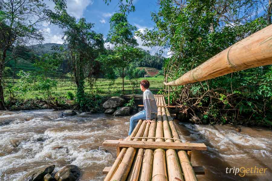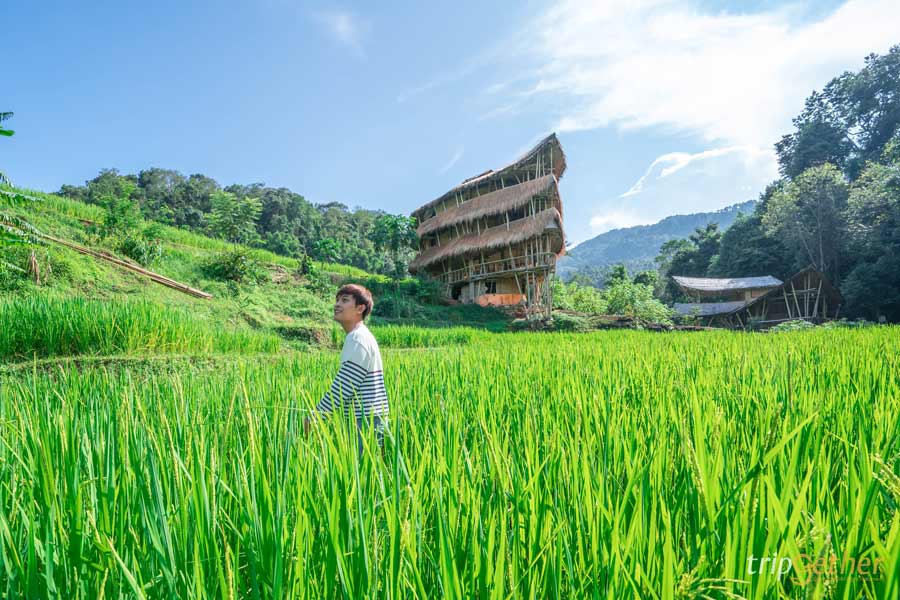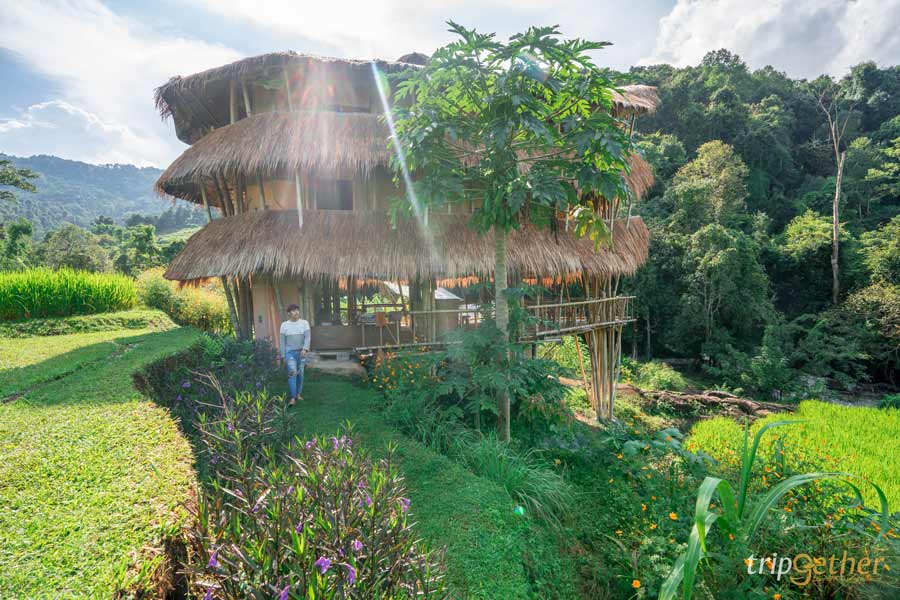 พามาปิดท้ายลิสต์ ที่พักดอยอินทนนท์ เชียงใหม่ ติดธรรมชาติ บรรยากาศดี วิวสวย ด้วยกันที่ บ้านไม้ไผ่ยักษ์ (Giant Bamboo Hut) พิกัดตั้งอยู่ระหว่างเส้นทางเดินธรรมชาติผาดอกเสี้ยว (น้ำตกรักจัง) ห่างจากหมู่บ้านเเม่กลางหลางประมาณ 1 กิโลเมตร บอกเลยว่ามาพักที่นี่จะได้สัมผัสกับความเป็นธรรมชาติแบบเต็มร้อย สูดกลิ่นของท้องทุ่งนา มีลมเย็นๆ พัดตลอดเวลา แถมตัวที่พักยังใช้วัสดุจากธรรมชาติอย่างไม้ไผ่แบบ 100% สูงขนาด 3 ชั้น ถูกออกแบบมาในสไตล์บาหลีผสมผสานกับธรรมชาติในพื้นที่ได้อย่างลงตัว สายกรีนหรือใครชอบบรรยากาศแบบนี้ต้องไม่พลาดบ้านไม้ไผ่ยักษ์เลยนะ