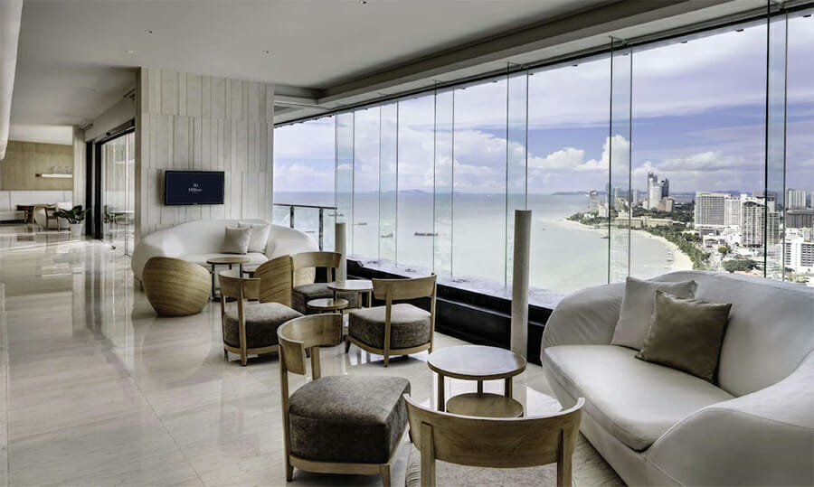 Hilton Pattaya โรงแรมหรูระดับ 5 ดาวที่ตั้งอยู่ใจกลางเมืองพัทยา ด้วยการออกแบบที่โดดเด่น ห้องพักและวิลล่าทุกห้องสามารถมองเห็นวิวทะเลพร้อมกับมีระเบียงส่วนตัวด้วย รวมไปถึงสระว่ายน้ำส่วนกลางขนาดใหญ่แบบอินฟินิตี้พูล ที่สามารถว่ายน้ำและมองเห็นวิวทะเลสวยๆ ของหาดพัทยาแบบเต็ม ถ่ายรูปเก๋ๆ เช็คอินในวันพักผ่อน นอกจากนี้ยังมีอีกหนึ่งไฮไลท์ของ Hilton Pattaya คือ Horizon Rooftop Restaurant & Bar ห้องอาหารและบาร์บนดาดฟ้าที่ตั้งอยู่บนชั้น 34 ของโรงแรมและสามารถชมวิวสวยๆ โดยเฉพาะช่วงพระอาทิตย์ตกบรรยากาศจะโรแมนติกสุดๆ ไปเลย