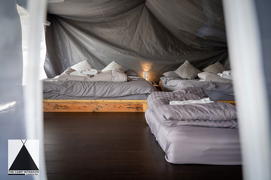 หนาวนี้ใครอยากไปนอนเต็นท์สัมผัสอากาศหนาวละก็ต้องแวะไปที่ Camp Inthanon จ.เชียงใหม่ เต็นท์ของที่นี่มีทั้งแบบห้องน้ำส่วนตัว และแบบห้องน้ำรวม บริเวณที่พักสามารถมองเห็นวิวขุนเขา น้ำตกสิริภูมิ ซึ่งไม่ต้องห่วงไม่ว่าจะพักหลังไหนก็สามารถมองเห็นวิวได้เหมือนกัน มีเต็นท์ให้เลือกพักทั้งหมด 3 แบบได้แก่ เต็นท์ Super VIP มีห้องน้ำในตัวพักได้ 2 คน เต็นท์ The Gang เหมาะสำหรับมากันเป็นกลุ่มใหญ่พักได้มากสุดถึง 6 คน และสุดท้ายเต็นท์ VIP มีให้เลือกทั้งแบบห้องน้ำในตัวและแบบห้องน้ำรวมพักได้ 2 คน ภายในเต็นท์กว้างขวางมาพร้อมสิ่งอำนวยความสะดวกครบครัน หากใครชอบปิ้งย่างก็มีหมูกระทะให้นั่งกินกันถึงหน้าเต็นท์เรียกได้ว่า สนุกสนานกันอย่างแน่นอน