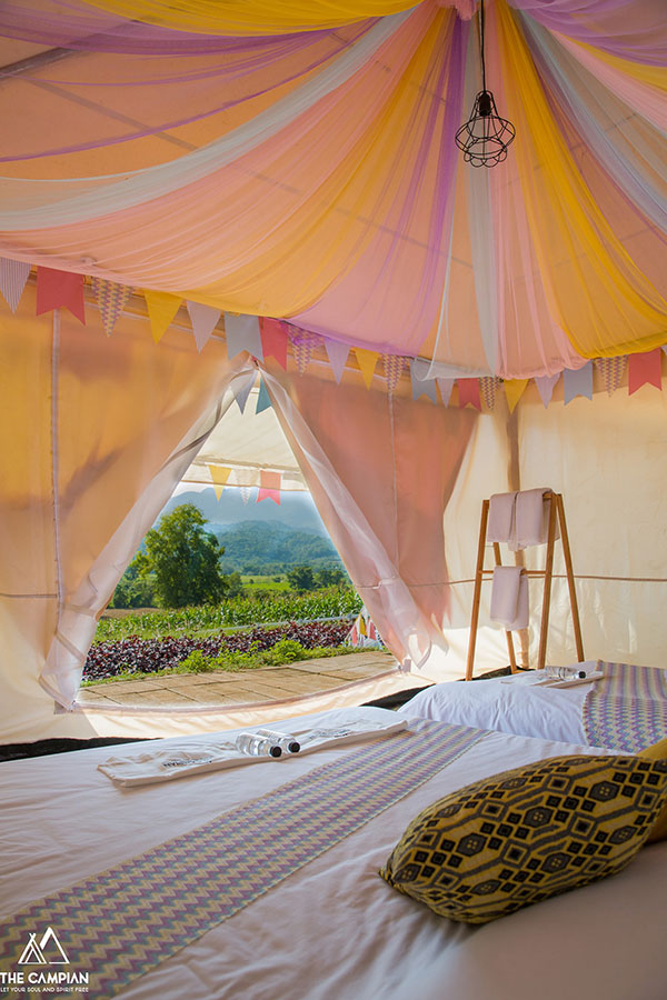 เดอะ แคมป์เปี้ยน ที่พักชิคๆ ที่ควรค่าแก่การพาเพื่อนสาวไปนอนพักผ่อนท่ามกลางธรรมชาติ ซึ่งอยู่ในโลเคชั่นที่สามารถมองเห็นวิวดอยหลวงเชียงดาวสุดอลังการได้อย่างเต็มตา สายแคมป์ปิ้งต้องถูกใจกับสไตล์การตกแต่งเต็นท์สุดเก๋ให้ความรู้สึกเหมือนอยู่ในงานเทศกาลเก๋ๆ ถ่ายรูปออกมาสวยได้รูปไปเปลี่ยนโปรไฟล์อย่างแน่นอนจ้า ภายในเต็นท์ก็เพียบพร้อมไปด้วยสิ่งอำนวยความสะดวกครบครันทั้ง ชุดเครื่องนอน ผ้าขนหนู น้ำดื่ม และอื่นๆ อีกมากมาย หากใครอยากนอนบ้านพักที่นี่ก็มีบ้านทรง A Frame สุดฮิปเอาใจคนชอบถ่ายรูปได้เป็นอย่างดี