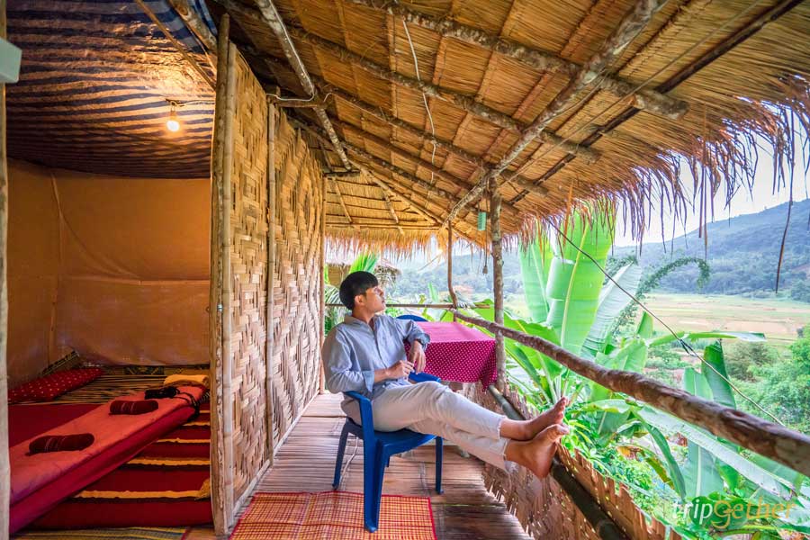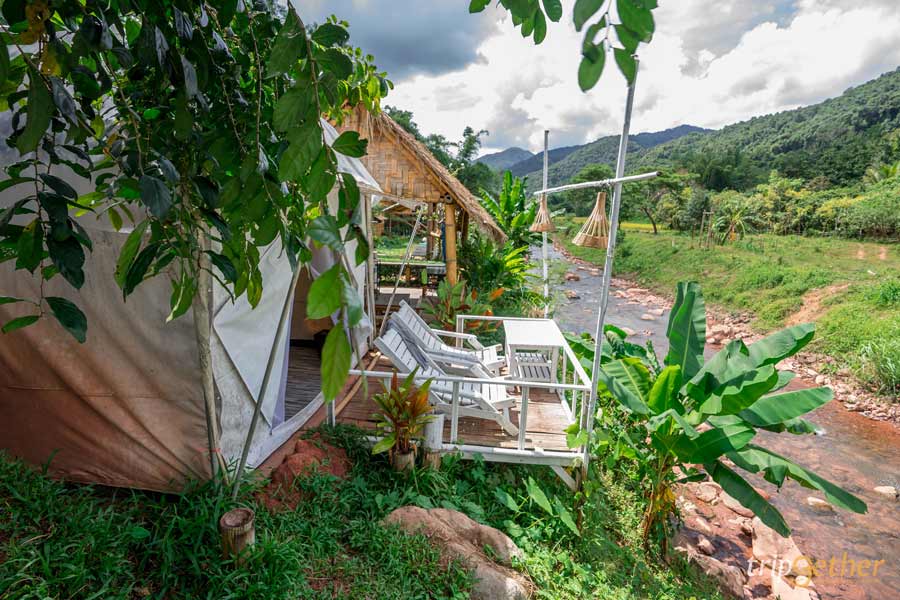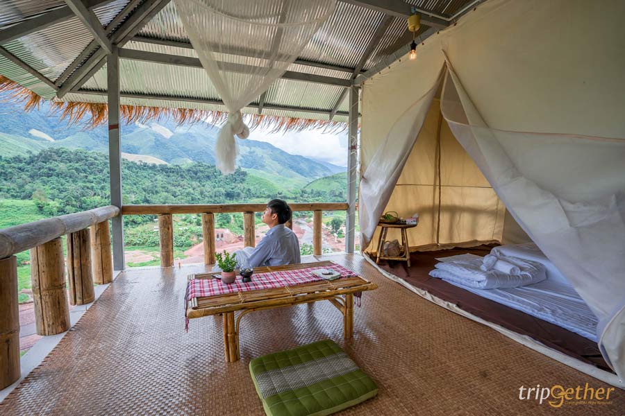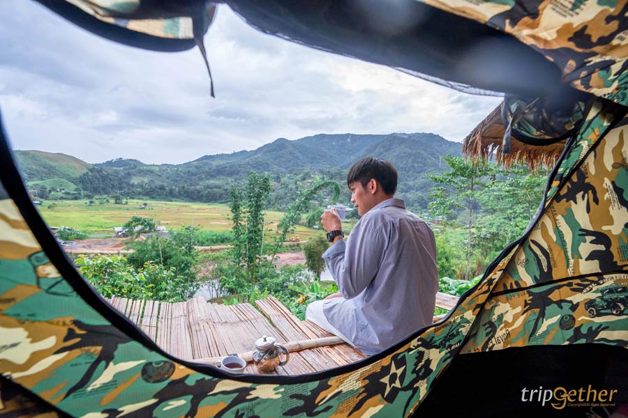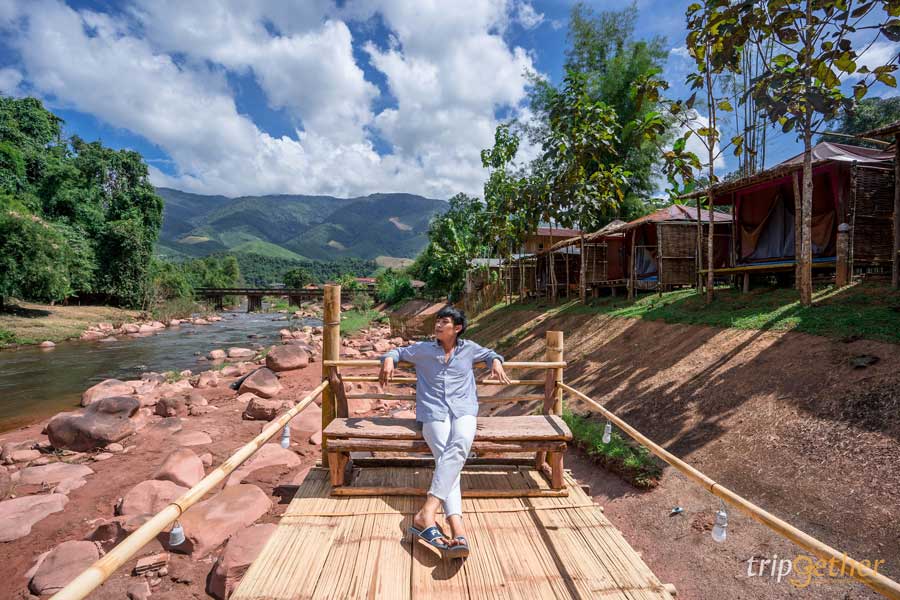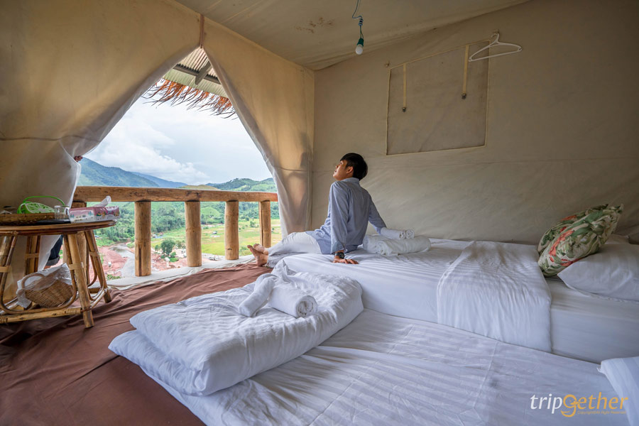 มาสัมผัสธรรมชาติและความเรียบง่ายกันต่อที่ มองว้า ยายทาตาสม ฟาร์มสเตย์ (Mongwa Farmstay) ที่พักหมู่บ้านสะปัน น่าน สไตล์ฟาร์มสเตย์ บรรยากาศดี แถมยังเต็มไปด้วยความอบอุ่นและเป็นกันเองมาก เหมือนมานอนบ้านญาติเลยล่ะ ราคาหลักร้อยแต่วิวหลักล้าน! จากที่พักสามารถมองเห็นลำน้ำว้าและขุนเขาอันเขียวขจี กลางคืนดูดาว ตื่นเช้ามาดูหมอกได้แบบฟินๆ ในส่วนของการเข้าพักที่นี่จะมีให้เลือกทั้งแบบเต็นท์ และบ้านกระท่อมไม้ไผ่ มาพร้อมอาหารเช้าและย็นแสนอร่อย ที่คุณยายทาเจ้าของฟาร์มสเตย์เป็นแม่ครัวเอง อาหารอร่อยสไตล์เหนือแท้ๆ เลยจ้า