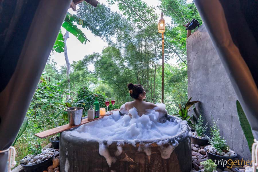 มาต่อกันที่อีกหนึ่ง ที่พักหมู่บ้านสะปัน น่าน บรรยากาศดีต่อใจ ที่ไม่ควรพลาดเป็นอย่างยิ่ง นั่นก็คือ บ่อเกลือ ริเวอร์ฮิลล์ (Boklua River Hills) ห้องพักของที่นี่มีทั้งหมด 7 หลังเท่านั้น! ซึ่งแต่ละหลังก็จะตกแต่งต่างกันออกไปไม่ซ้ำกัน ทั้งดีไซน์ห้อง ห้องน้ำ อ่างแช่น้ำ วิวของแต่ละหลังก็ให้ฟีลต่างกัน แต่รับประกันสวยปังประทับใจทุกห้อง ถ่ายรูปทำคอนเท็นต์ได้เพียบ! และมาที่นี่ห้ามพลาดสปาเท้าหินแร่ด้วยเกลือสปาภูเขากลิ่นหอม ผ่อนคลายสบายเท้าสุดๆ เลยล่ะ ในส่วนของเรื่องอาหารการกินที่บ่อเกลือ ริเวอร์ฮิลล์ จัดเต็มให้ทั้งเช้า และเย็น รสชาติอร่อย ถูกปากถูกใจแน่นอน