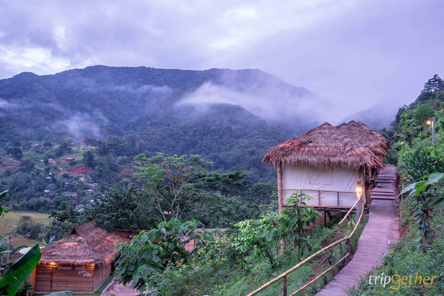 ถัดมาที่ สายหมอกบอกฮัก อีกหนึ่งที่พักหมู่บ้านสะปัน น่าน บรรยากาศดี ตั้งอยู่ท่ามกลางธรรมชาติของขุนเขาและลำน้ำว้าที่ไหลผ่าน ถ้ามาในช่วงหน้าฝนซึ่งเป็นฤดูทำนา บอกเลยว่าสวยฉ่ำ! ด้วยวิวทิวทัศน์ของนาข้าวเขียวขจี โดยที่นี่มีห้องพักทั้งหมด 3 แบบ คือ กระโจมแบบมีระเบียงส่วนตัว, กระโจมแบบไม่มีระเบียง, และ ห้องไม้ไผ่ วิวสวยทุกหลังแน่นอน! เรียกได้ว่าพอเปิดม่านมาก็เจอวิวภูเขา หมอกลอยฟุ้ง ตัดกับทุ่งนาสีเขียว ใจฟูมาก แถมอากาศก็เย็นสบายตลอดทั้งวัน ไม่ต้องเปิดแอร์เลยล่ะ ใครกำลังหาโลเคชั่นพักผ่อนใกล้ชิดกับธรรมชาติ ใช้ชีวิตแบบ Slow Life แนะนำที่นี่เลย