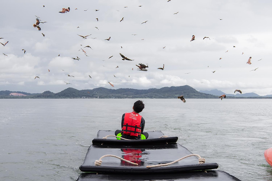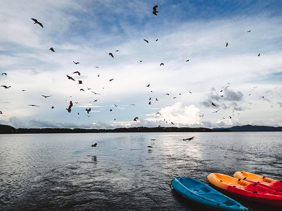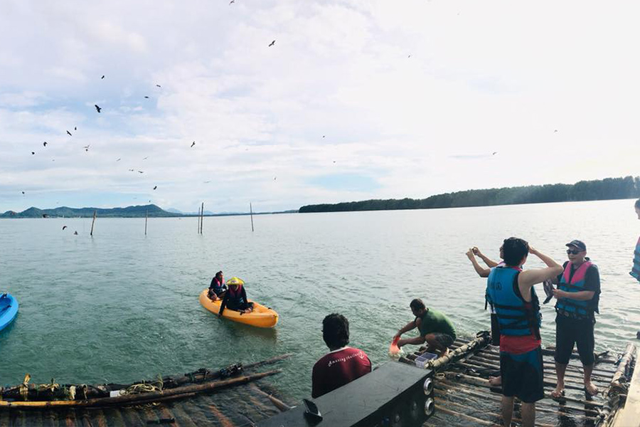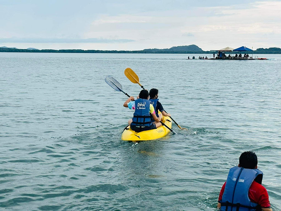 ล่องเลโฮมสเตย์ ที่พักหมู่บ้านไร้แผ่นดิน ตั้งอยู่กลางทะเล จากที่พักมองเห็นวิวทิวทัศน์แบบพาโนราม่าและใกล้ชิดกับน้ำมาก เรียกได้ว่าเดินมาเล็กน้อยก็จุ่มเท้าแช่น้ำเย็นๆ ได้เลย หรือใครสายลุยหน่อยก็มีกิจกรรมทางน้ำ อย่างพายเรือคายัค ล่องแพเปียก ชมฝูงเหยี่ยว เล่นน้ำที่ทะเลแหวก ส่วนไฮไลท์ก็คือช่วงเย็นในระหว่างล่องแพเปียกก็สามารถชมพระอาทิตย์ตกดิน บอกเลยว่าสวยฟินมาก สำหรับอาหารก็มีให้กินเต็มอิ่ม 3 มื้อ ยิ่งมื้อเย็นได้กินอาหารทะเลฉ่ำๆ วัตถุดิบสดๆ ทั้งกุ้ง ปู หมึกมาแบบครบ ถ้าใครต้องการเปลี่ยนบรรยากาศการพักผ่อนเสาร์ – อาทิตย์ก็เตรียมปักหมุดเลย