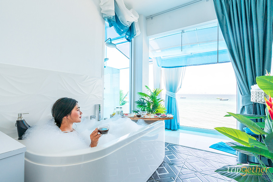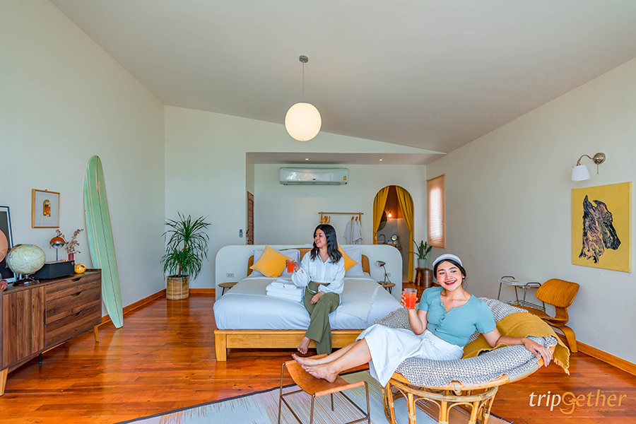 วางเวลา โฮมสเตย์บูติกที่มีการออกแบบและตกแต่งในสไตล์ Mid-century modern ดูเรียบง่ายและให้บรรยากาศที่รู้สึกอบอุ่น รวมถึงเฟอร์นิเจอร์ส่วนใหญ่ทำมาจากไม้ผสมกับของตกแต่งเล็กๆ น้อยๆ ที่เป็นเหมือนของเก่าสะสม ดูวินเทจมาก แค่ในห้องก็มีมุมถ่ายรูปสวยๆ มากมายเลย นอกจากนี้ยังมีหน้าต่างบานใหญ่ที่หันหน้าเข้าหาทะเล เพียงแค่เปิดหน้าต่าง เดินออกมาที่ระเบียงก็สามารถรับลมทะเลสบายๆ เพิ่มความพิเศษด้วยอ่างจากุซซี่ส่วนตัวที่น่าลงไปแช่น้ำฟินๆ ชมวิวทะเลแบบเต็มๆ ตา ถ้าใครอยากมานอนพักผ่อนชิลล์ๆ แบบนี้ ต้องรีบวางแพลนแล้วกดจองที่พักเลยเพราะห้องพักที่นี่มีเพียงแค่ 2 ห้องเท่านั้น เอ็กคูลซีฟสุดๆ