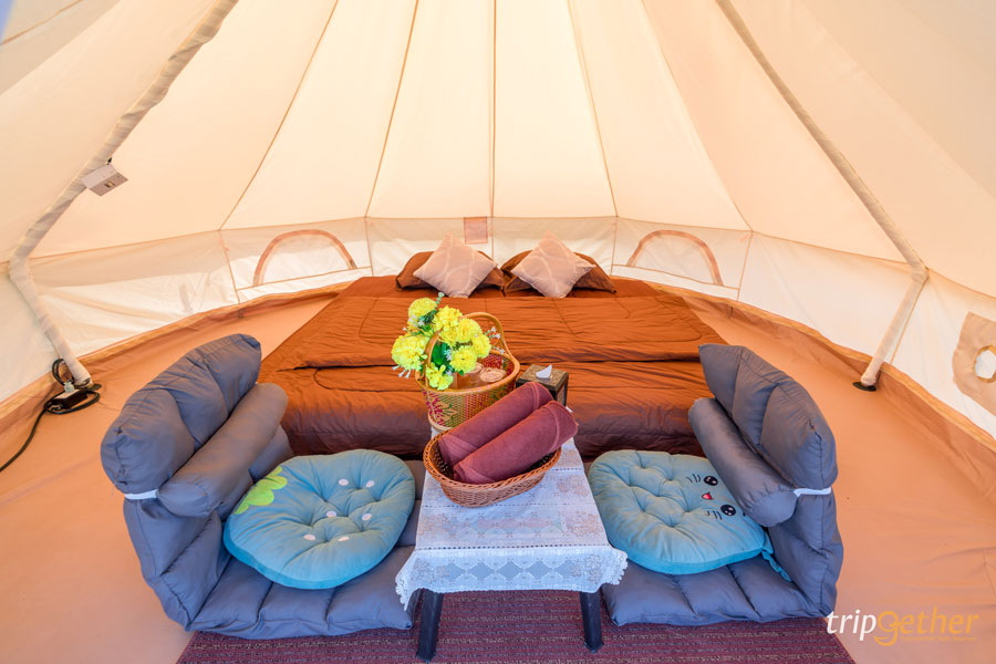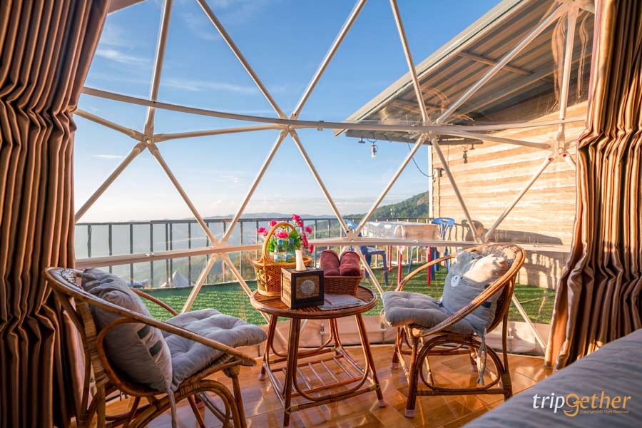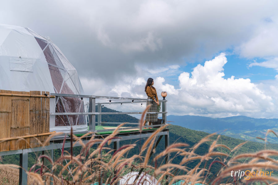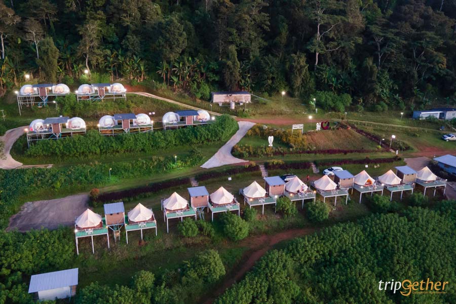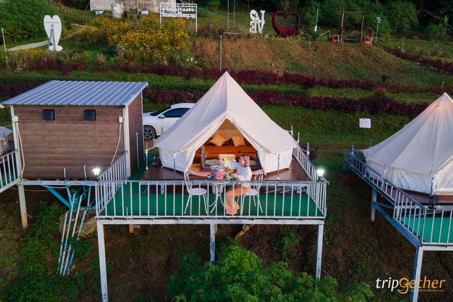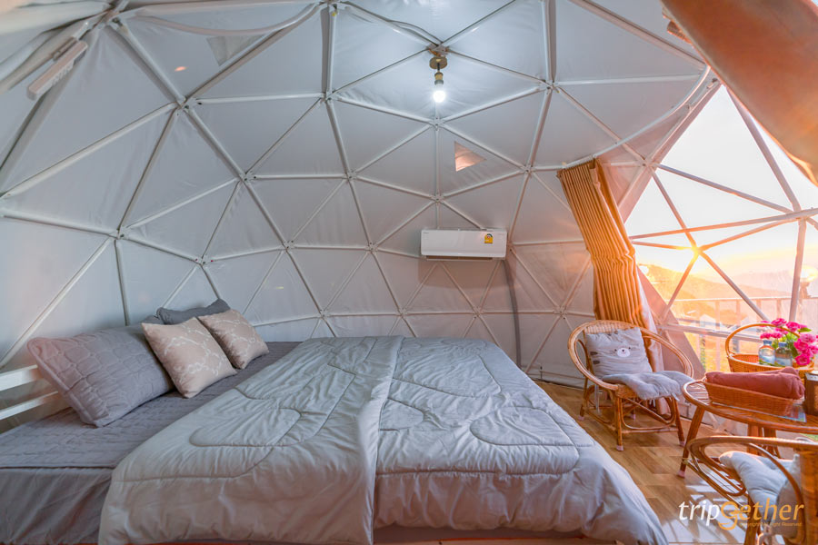 เอาใจสายแคมป์ปิ้งด้วย ภูทองแคมป์ (Phuthong Camp) ที่พักบนภูชี้ฟ้า พิกัดดีงามมากเพราะตั้งอยู่บนเนินสูง ข้างหลังเป็นผืนป่า ข้างหน้าเป็นวิวหุบเขา บอกเลยว่าวิวสวยอลังการสุดๆ ส่วนที่พักแบ่งออกเป็น 2 โซนใหญ่ๆ ก็คือโซนด้านบนที่เป็น เต็นท์โดมใสและโซนล่างเป็น เต็นท์กระโจม โดยเต็นท์แต่ละหลังจะมีห้องน้ำส่วนตัว พร้อมระเบียงนั่งชิลล์ดูวิวกันฉ่ำๆ ตกเย็นนั่งกินหมูกระทะร้อนๆ หน้าเต็นท์กับภาพพระอาทิตย์ตกดิน เรียกได้ว่าเสพธรรมชาติเต็มๆ แบบไม่ต้องไปไหนไกล