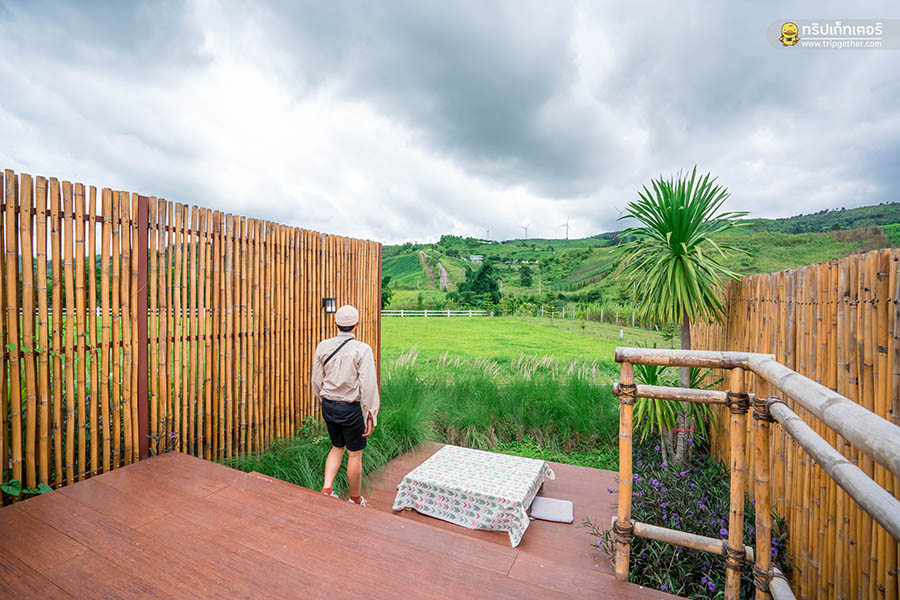 Behind Khaokho ที่พักในโดมโอบล้อมด้วยไม้ไผ่และธรรมชาติ ทางเข้าออกแบบได้ดีกว้างขวาง งานสถาปัตยกรรมเน้นโครงสร้างโปร่งให้ลมสามารถพัดผ่านเข้ามาได้ตลอดเวลา ตกแต่งด้วยผ้าสีขาวให้พริ้วไปตามลม ส่วนของห้องพักแบบออกเป็น 2 โซน คือโซนวิวกังหันลม และโซนวิวสวน ทั้ง 2 โซนมีความแตกต่างกันแค่วิวหน้าห้องแต่ภายในห้องพักเหมือนกัน ห้องน้ำแยกออกมาข้างๆ มีพื้นที่ให้นั่งเล่น ตรงพื้นที่ส่วนหน้าโดม สามารถนั่งทานอาหารได้เลย มีทั้งอาหารจานเดียวและหมูกะทะ สามารถเลือกได้ตามความชอบ นอกจากนี้ยังมีจักรยานให้ปั่นเล่น กิจกรรมชมวิวรอบๆที่พักให้บริการ บอกเลยว่าเป็นการมาพักผ่อนที่ชิลล์มากๆ พื้นที่สวน ทิวเขาสีเขียวรอบๆที่พัก วิวกังหันลม มีหลายจุดเลยที่สามารถเก็บภาพสวยๆได้ บอกเลยว่าที่นี้เป็นอีกหนึ่งที่พักที่ถ่ายรูปออกมาได้สวยมากๆ คนชอบถ่ายรูปไม่ควรพลาด มาเขาค้อ ต้องมานอนสักครั้ง