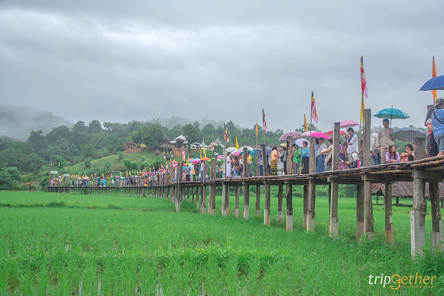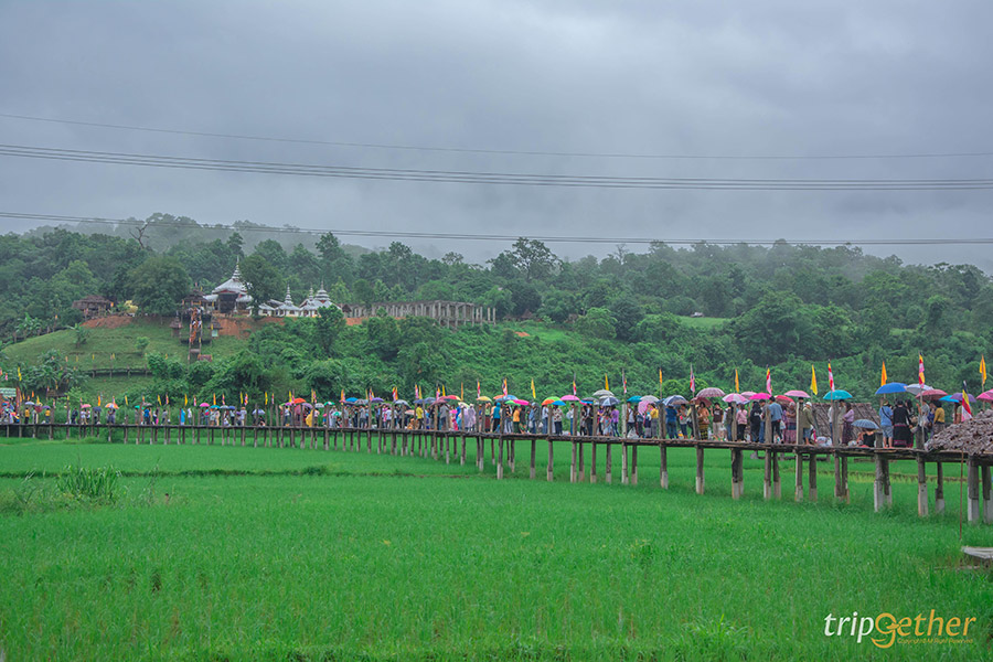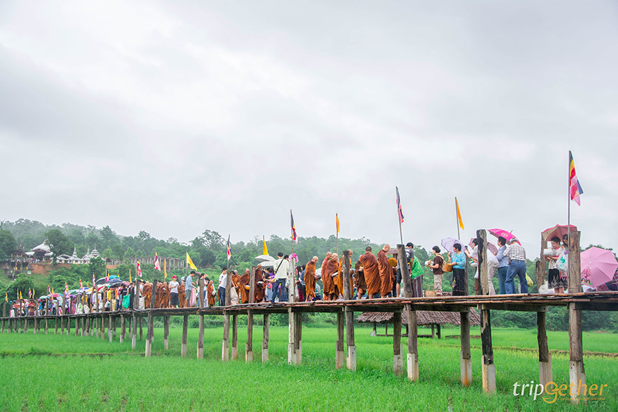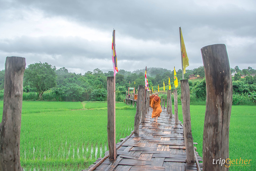 สะพานซูตองเป้ สะพานที่เกิดจากน้ำพักน้ำแรงและความศรัทธาของคนในพื้นที่ จึงกลายเป็นที่มาของชื่อ “ซูตองเป้” ภาษาไทใหญ่แปลว่า อธิษฐานสำเร็จ โดยสะพานนี้เป็นสะพานไม้ไผ่ที่ทอดยาวกลางทุ่งนา เชื่อมต่อระหว่างสวนธรรมภูสมะและหมู่บ้านกุงไม้สัก ถ้ามาในยามเช้าเวลา 06.00 น. ก็จะมีพระมาบิณฑบาตร เป็นภาพที่ดูเรียบง่ายและสวยงามมาก บวกกับบรรยากาศในยามเช้าเย็นสบาย มีสายหมอก และแสงอาทิตย์สะท้อนนาข้าว บอกเลยว่าเป็นตื่นเช้ามาเติมแต้มบุญที่คุ้มค่าสุดๆ และถ้าอยากได้ภาพความครึกครื้นก็แนะนำให้มาในวันสำคัญทางพุทธศาสนา บริเวณสะพานจะเนืองแน่นไปด้วยชาวบ้านและนักท่องเที่ยวมาทำบุญตักบาตรกัน เป็นภาพที่ตื่นตาตื่นใจมาก