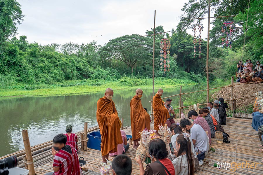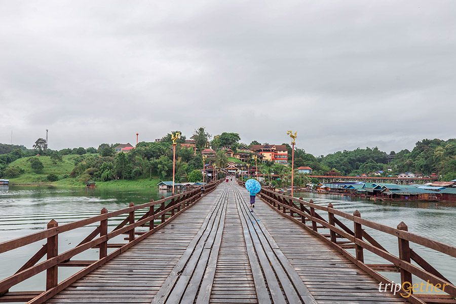 ถ้าพูดถึงที่เที่ยวสายบุญสำหรับการตักบาตรตอนเช้าของกาญจนบุรี สะพานมอญสังขละบุรี น่าจะเป็นจุดที่ใครหลายคนนึกถึงกัน อีกทั้งยังเป็นสะพานที่มีเรื่องราวและความสำคัญในการเชื่อมสองวัฒนธรรมอย่างมอญและไทยเข้าด้วยกัน ดังนั้นผู้ที่มาจะสัมผัสได้ถึงความน่ารักของวิถีชีวิต ประเพณี และการแต่งกายของชาวมอญ นอกจากนี้ไฮไลท์ก็คือช่วงเช้าเวลาประมาณ 06.30 – 07.00 น. กับการตักบาตรมอญ สามารถซื้อชุดตักบาตรได้ที่หน้าสะพาน ซึ่งบริเวณนี้จะมีชาวบ้านและประชาชยืนรอพระบริเวณถนน หลังจากทำบุญเสร็จ ก็มาเดินเล่นต่อที่สะพานมอญ สัมผัสอากาศเย็นสบายๆ และมีสายหมอกคลอเคลีย บรรยากาศฟินๆ แถมได้เติมแต้มบุญแบบนี้จะพลาดได้ไงล่ะ