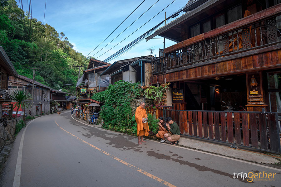หมู่บ้านแม่กำปอง หนึ่งในหมู่บ้านสุดสโลว์ไลฟ์ทางภาคเหนือที่ใครไปต่างก็หลงในเสน่ห์ความเรียบง่าย บวกกับมีธรรมชาติของขุนเขาและป่าไม้โอบล้อมหมู่บ้าน รวมถึงน้ำตกไหลผ่านกลางหมู่บ้าน บรรยากาศชิลล์ขนาดนี้ทำให้มีนักท่องเที่ยวแวะเวียนไม่ขาดสาย นอกจากจะไปพักผ่อนสบายๆ กิจกรรมที่ห้ามพลาดก็คือการตักบาตรยามเช้า ใครที่อยากทำบุญยามเช้าก็สามารถซื้อชุดตักบาตรได้จากร้านขายของได้เลย หลังจากนั้นพระจะเริ่มลงมาบิณฑบาตรประมาณ 07.00 น. หรือถ้าใครตื่นมาไม่ทันพระก็สามารถเดินขึ้นไปที่วัดเพื่อทำบุญได้เหมือนกัน