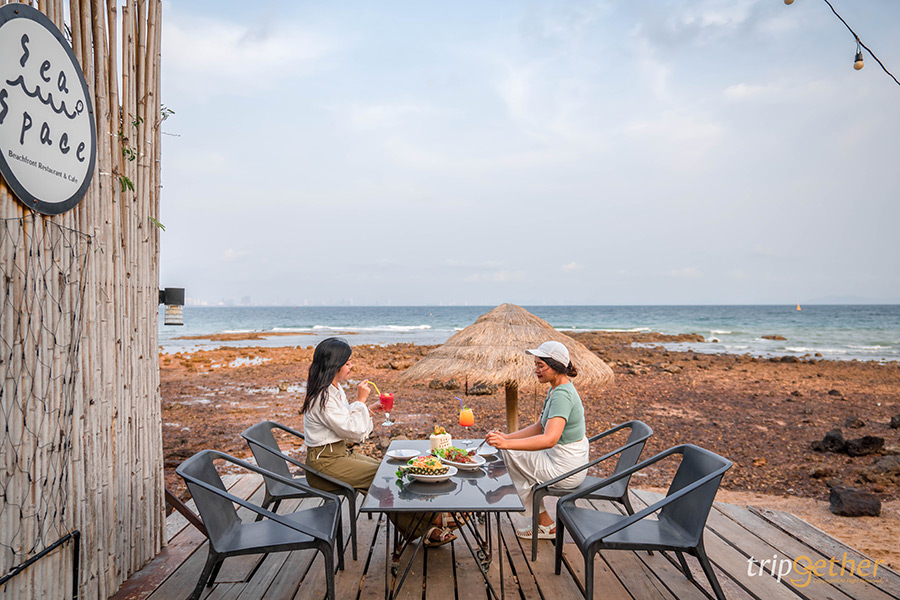 ข้ามมาที่เกาะใกล้ๆ กรุงเทพอย่างเกาะล้านกันบ้างกับ ซีสเปซ ร้านที่เป็นทั้งคาเฟ่และร้านอาหารติดทะเลวิวสวยสุดเด็ด ภายในร้านแบ่งเป็น 2 โซน คือโซนอินดอร์ในห้องแอร์มีกระจกบานใหญ่ที่สามารถชมวิวทะเลได้ และโซนเอาท์ดอร์ริมทะเลที่จะเปิดให้บริการ 17.00 น. เป็นต้นไป เมนูเด็ดของทางร้านก็มีให้เลือกหลากหลายทั้ง ข้าวผัดสับปะรด ปลากะพงสามรส ห่อหมกทะเลมะพร้าวอ่อน และยำแมงกะพรุนซด อีกทั้งยังมีเครื่องดื่มอีกมากมายให้เลือกได้ตามใจชอบ กินอาหารอร่อยๆ พลางมองวิวทะเลฟินสุดๆ และที่พลาดไม่ได้เลยถ้ามาช่วงเย็น จะได้ชมวิวพระอาทิตย์ตกลงในน้ำทะเล บอกเลยว่าสวยจนแทบลืมหายใจ รู้แบบนี้แล้วอย่าลืมพาคนที่เรารักมาเช็คอินกันนะ