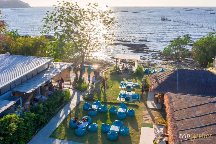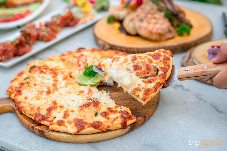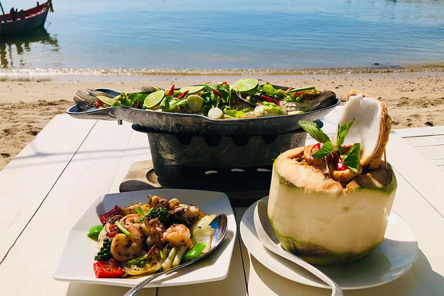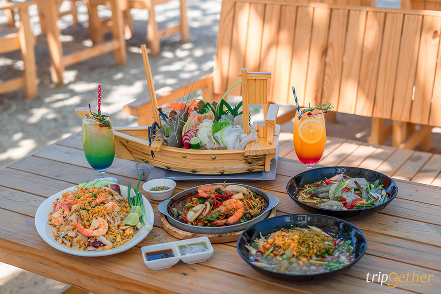 เปลี่ยนมื้อเที่ยงและมื้อเย็นให้เป็นมื้อพิเศษริมทะเลได้ที่ Sea Salt Seafood & Wine ร้านอาหารสุดหรู บรรยากาศสุดชิลล์ริมทะเลบนชายหาดส่วนตัว ที่มีเมนูอาหารให้เลือกมากมายไม่ว่าจะอาหารไทย อาหารฝรั่ง ส่วนของเมนูแนะนำคือ กุ้งลายเสือผัดพริกเกลือ ปลาหมึกหอมผัดไข่เค็ม ต้มยำกุ้ง ปลากะพงทอดราดน้ำปลา ขาหมูเยอรมันทอดกรอบ ห่อหมกมะพร้าวอ่อนรวมมิตรทะเล เบอร์เกอร์เนื้อสับสุดพรีเมี่ยม และเฟรนซ์ฟราย ท็อปด้วยหน้าเนื้อสับสไตล์ sloppy joe พร้อมชีสยืด ๆ นอกจากเมนูอาหารที่หลากลายให้เลือกกินกันอย่างอิ่มท้องแล้ว ใครเป็นสายถ่ายรูปเช็คอินจะต้องชื่นชอบเพราะทางร้านมีมุมถ่ายรูปชิคๆ มากมาย ที่สำคัญทางร้านมีดนตรสดให้ฟังกันทุกวัน และทุกวันเสาร์ – อาทิตย์ วันหยุดนักขัตฤกษ์ มีโชว์สุดพิเศษอย่างควงกระบองไฟให้เพลิดเพลินกันระหว่างมื้ออาหารด้วย
